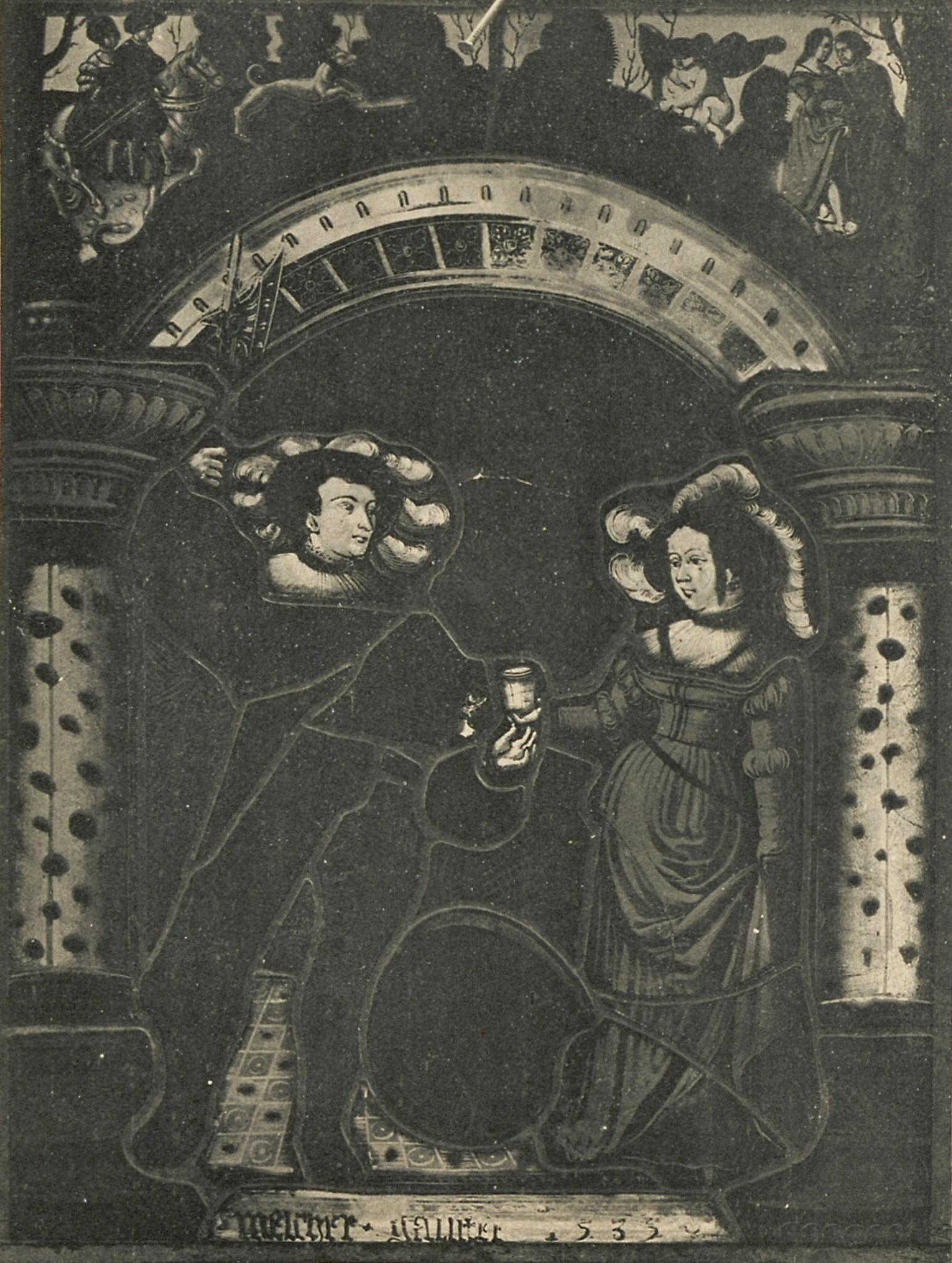 Das Glasgemälde ist einzig durch das Foto im Heberle-Katalog von 1884 bildlich dokumentiert. Soweit erkennbar lautet der darauf schlecht lesbare Name des Stifters auf Melchior Galliker. Diese Person konnte bislang nicht identifiziert werden und ebenso wenig lässt sich über die Herkunft ihrer als frühes Beispiel einer Willkommscheibe zu wertenden Wappenstiftung etwas Genaueres sagen.
