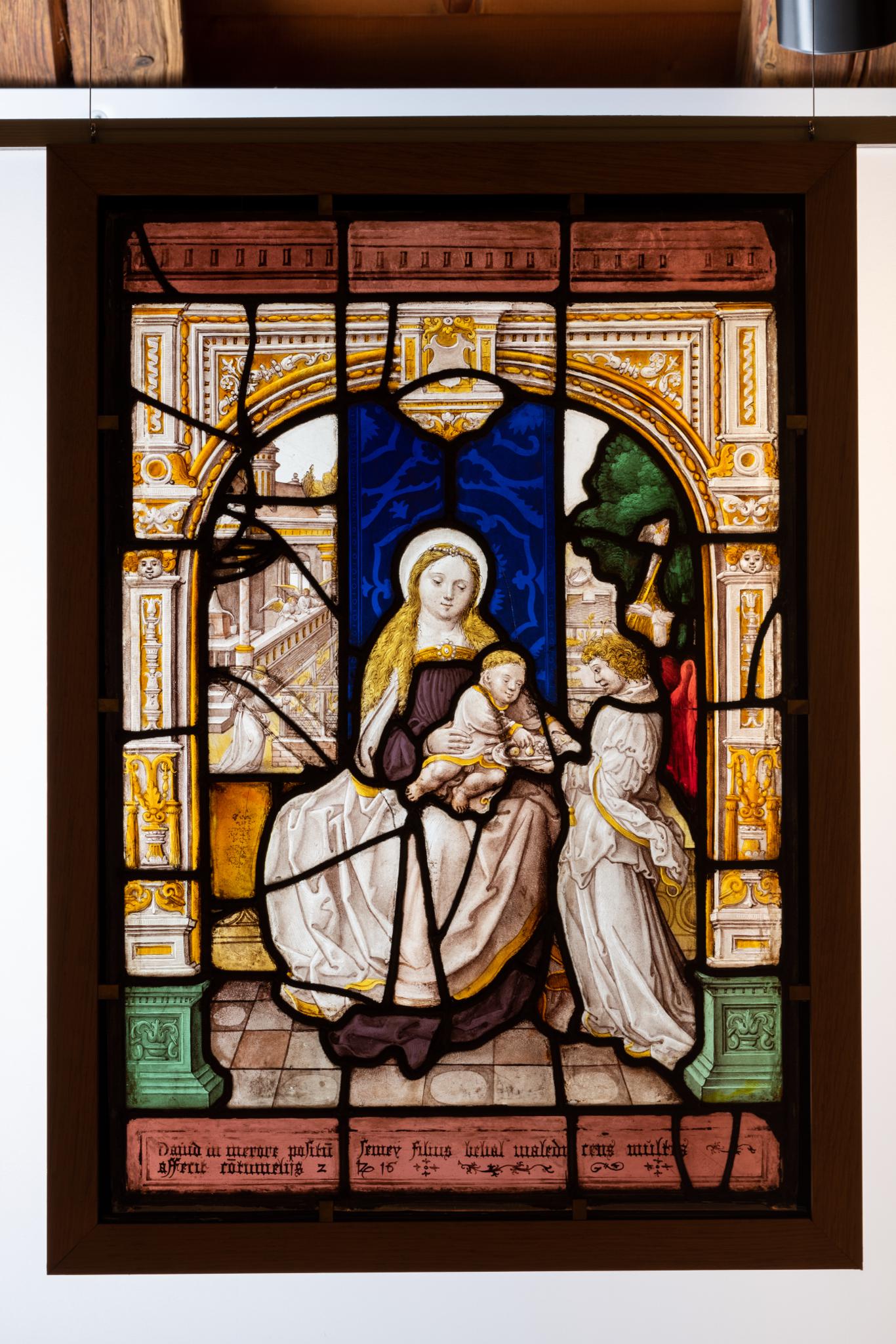 Aussi, l’invention voire l’exécution de ce panneau ont été rapprochées de l’oeuvre de Lucas van Leyden (1494-1533) (Kurmann-Schwarz et Trümpler 2006 – cf. Romont, Vitromusée Romont, documentation, inv. VMR 647, consultée le 4 avril 2022), éventuellement la figure écrasée de l’enfant que l’on peut retrouver dans une xylographie de ce dernier, daté de 1514, représentant une Vierge à l’Enfant assise sous un arbre (Amsterdam, Rijksmuseum, Print, inv. RP-P-OB-1662). Le langage employé, caractérisé par des formes arrondies et une culture qui oscille entre un gothique tardif et une renaissance fantaisiste, trahit plutôt une culture visuelle des anciens Pays-Bas méridionaux, probablement un peintre périphérique, peut-être de Louvain voire de Malines, qui, actif vers 1520, n’est pas insensible aux oeuvres graphiques d’Albrecht Dürer (1571-1528). Dans l’état actuel des recherches, aucune proposition d’attribution satisfaisante ne peut, pour l’heure, être formulée.