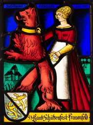 Wappen Frauenfeld: Ein steigender roter Löwe, von roter, gelbgezierter Frau an gelber Kette gehalten. Wappen Thurgau: Schräg geteilt von Silber und Grün mit zwei goldenen Löwen.