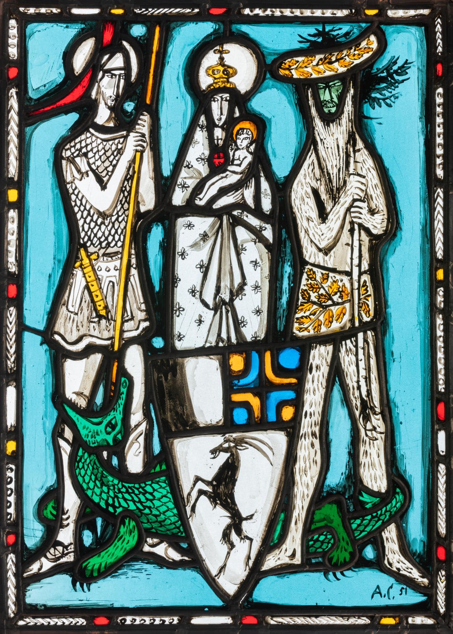 11H(GEORGE) · Georges, guerrier martyr; attributs possibles : bannière (croix rouge en champ blanc), croix (rouge), dragon, cheval (blanc), lance brisée, bouclier (marquée d'une croix), épée