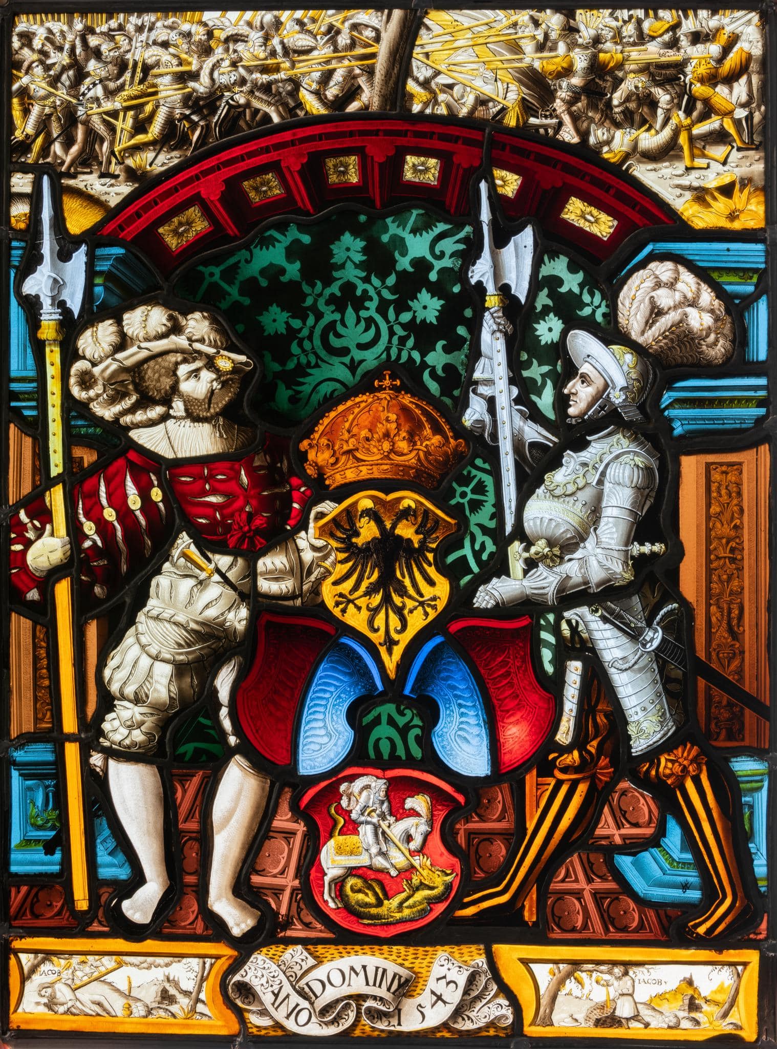 Vor grün-schwarzem Damastgrund stehen sich zwei Landsknechte mit Halbarten sowie Dolch bzw. Schwert als Schildhalter für das Wappen von Stein am Rhein auf roten Kacheln gegenüber. Der linke Landsknecht ist mit einer geschlitzten weiss-roten Tracht mit weissen Beinkleidern bekleidet, der rechte trägt einen silbernen Halbharnisch mit gelb-schwarzem Beinkleid. Über dem Georgenwappen folgt das Stadtwappen mitsamt gespiegeltem Abbild, darüber das bekrönte Reichswappen. Zwei rote Säulen mit blauen Kapitellen tragen einen roten Flachbogen. Darüber im Oberbild Schlachtszenen. Unten befindet sich das Schriftband mit der Jahreszahl, seitlich davon zwei Szenen der Geschichte Jakobs: links die Leiter, rechts das Opfer.