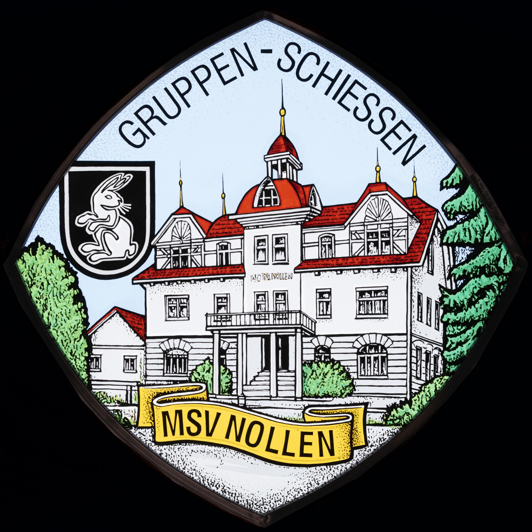Das Glasgemälde besteht aus einer Monolith-Scheibe und hat die Form einer Raute mit leicht ausgebuchteten Seiten. Dargestellt ist das Hotel Nollen, rechts und links ragen Bäume in die Darstellung. Links oben ist das Wappen des MSV Nollen zu sehen.