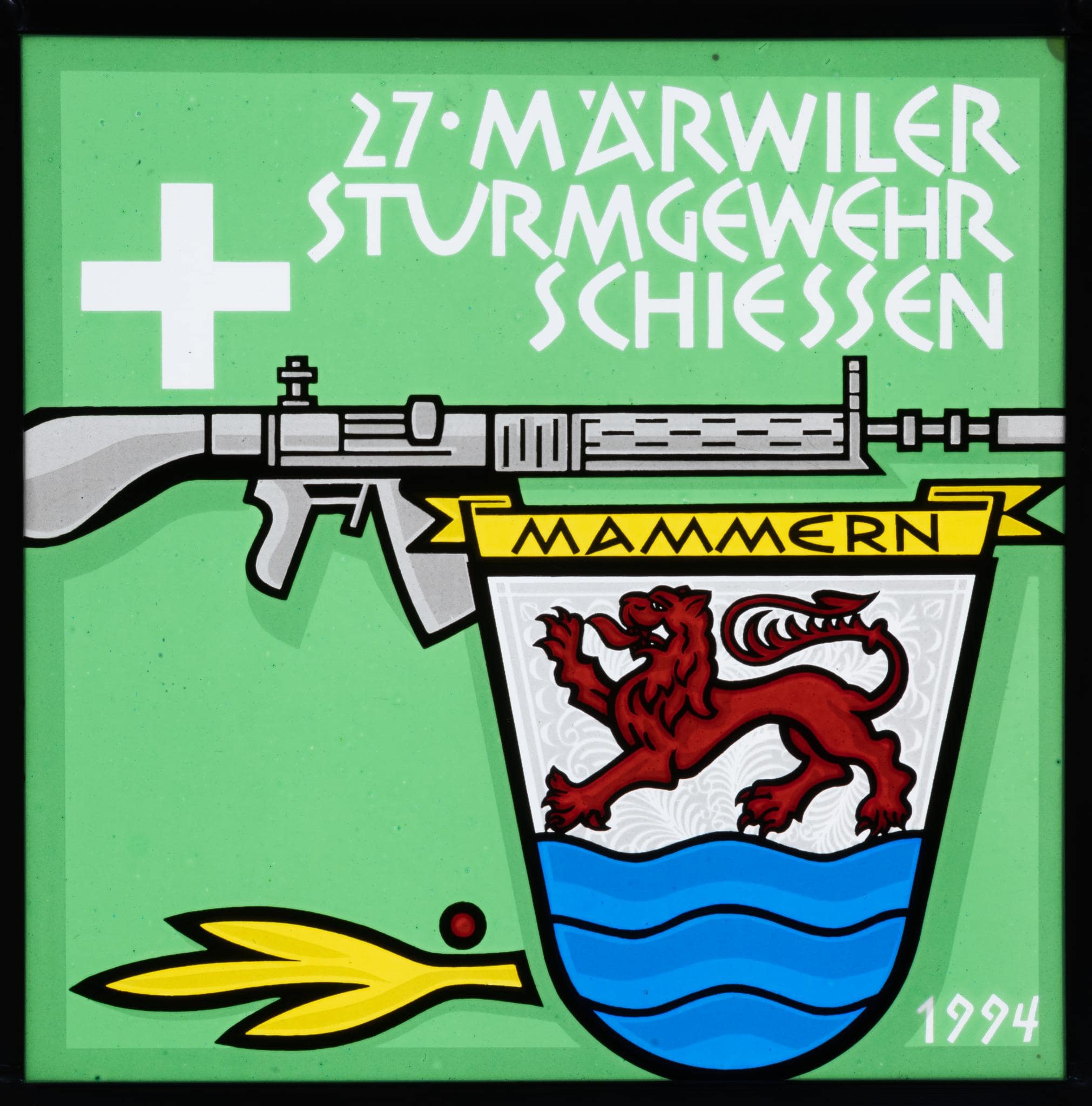 Quadratische Schützenscheibe mit grünem Grund. Etwas über der mittleren Höhe ist von links nach rechts ausschnitthaft ein Sturmgewehr dargestellt, wobei der vordere Teil des Kolbens und das Ende des Laufs nicht zu sehen sind. An diesem ist das Wappen von Mammern befestigt. Oben links, neben der Inschrift, befindet sich ein weisses Schweizer-Kreuz. Unten links ist horizontal eine Getreideähre abgebildet.