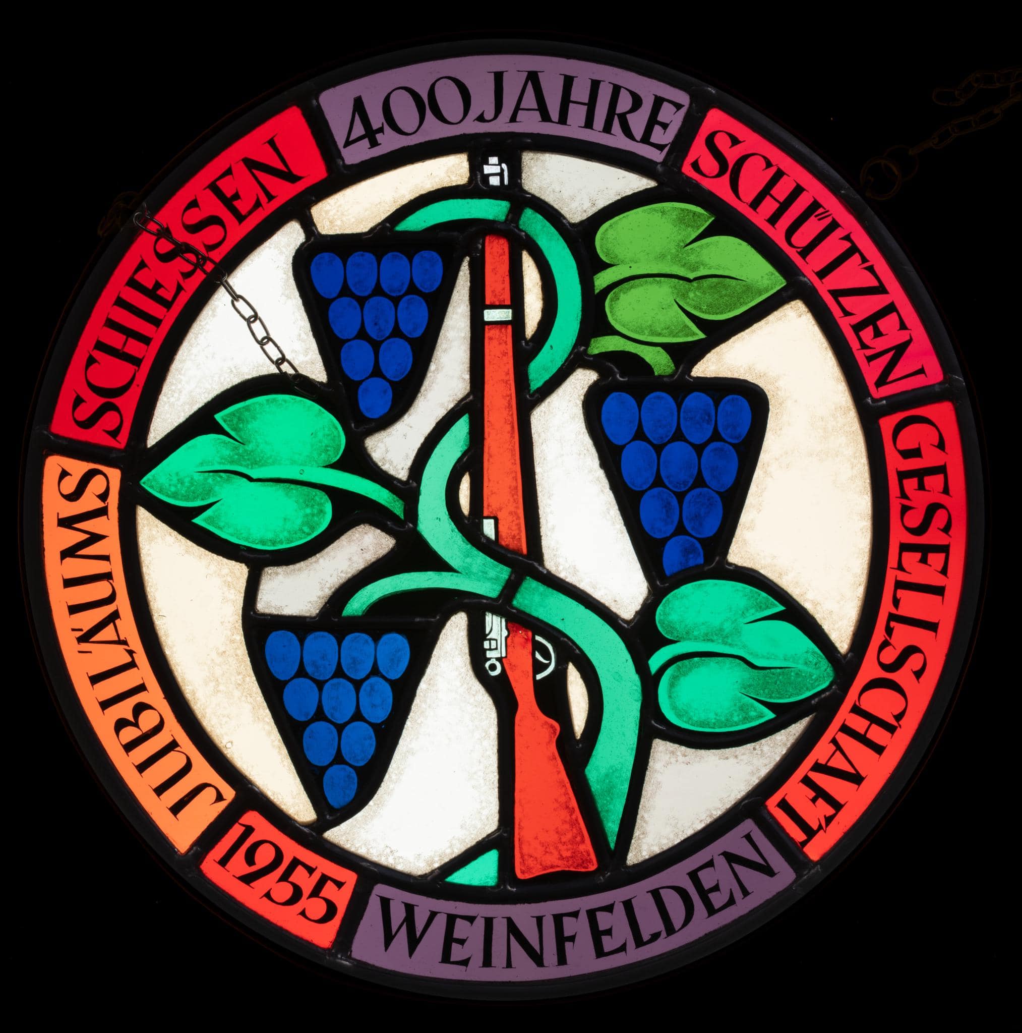Diese Wappenscheibe entstand anlässlich des 400-Jahre-Jubiläum der Schützengesellschaft Weinfelden 1955 (vgl. TG_79).