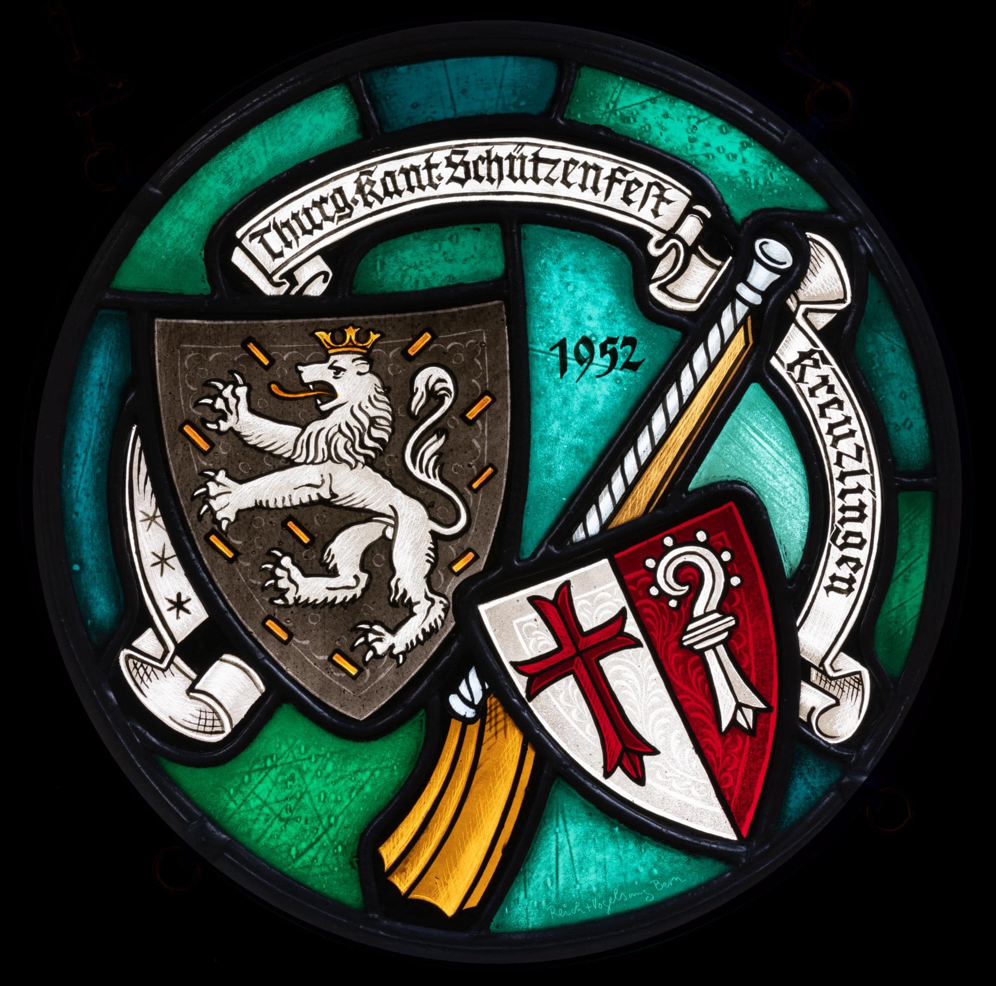 Thurg. Kant. Schützenfest Kreuzlingen (oben und rechts auf dem Inschriftenband), 1952 (in der Mitte rechts; zwischen Büchse, Familienwappen und Inschriftenband)