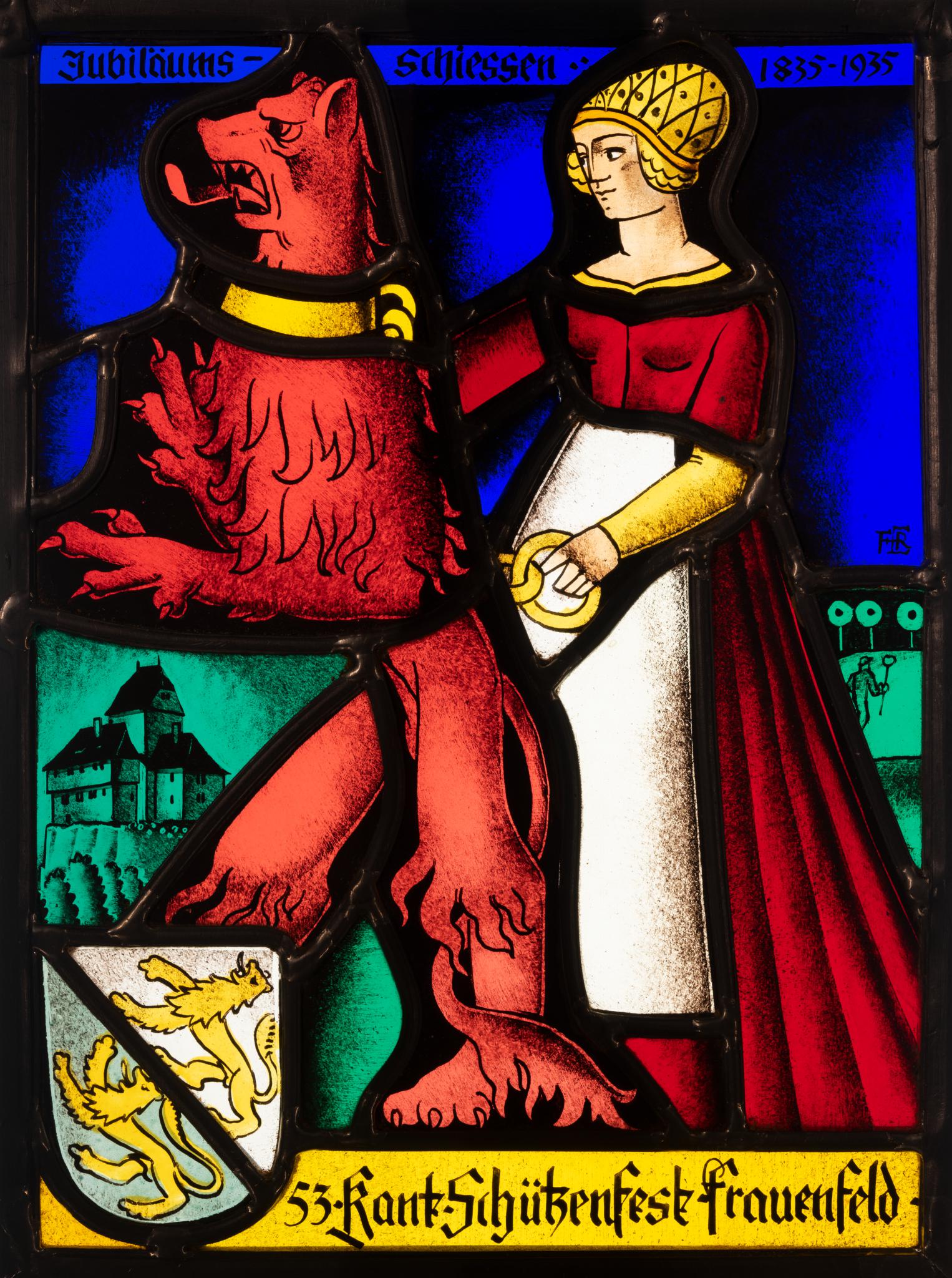 Wappen Frauenfeld: Ein steigender roter Löwe, von roter, gelbgezierter Frau an gelber Kette gehalten. Wappen Thurgau: Schräg geteilt von Silber und Grün mit zwei goldenen Löwen.