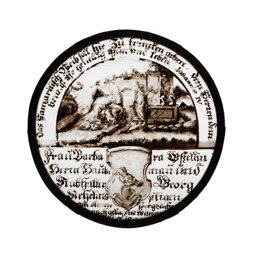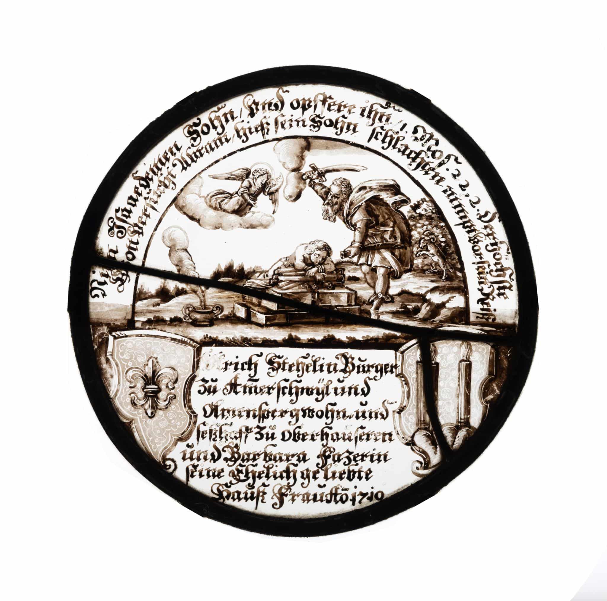 Die runde Wappenscheibe ist zweigeteilt und zeigt im unteren kleineren Bereich beidseitig je ein Wappen, dazwischen befindet sich ein Teil der Inschrift. Im oberen Bildfeld ist die Opferung Isaaks durch seinen Vater Abraham zu sehen (1. Mose 22).