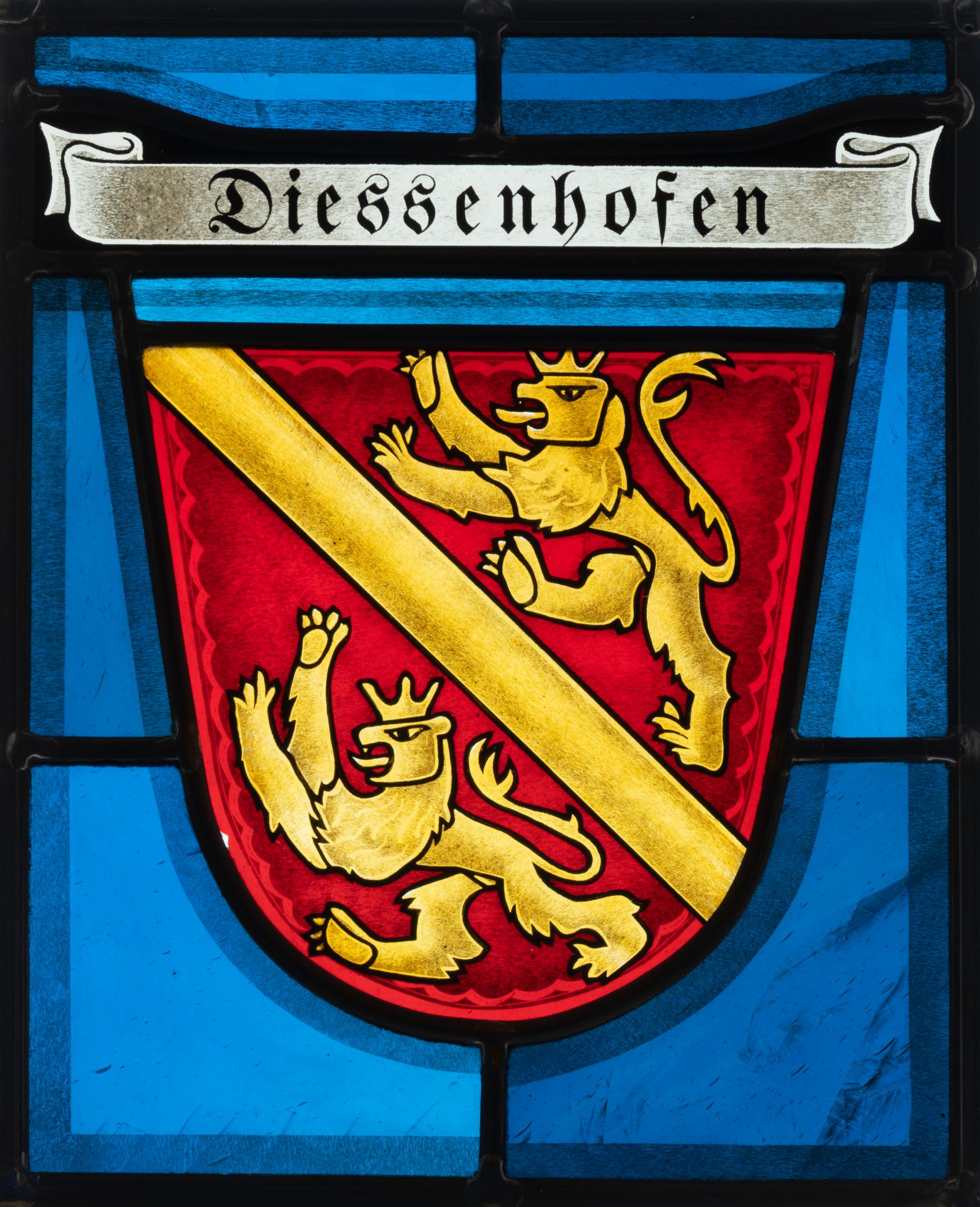 Die rechteckige Scheibe weist einen blauen Grund auf, darauf liegt die Darstellung des Wappens von Diessenhofen auf. Über dem Wappen befindet sich ein Inschriftenband mit der Bezeichnung des Wappens.