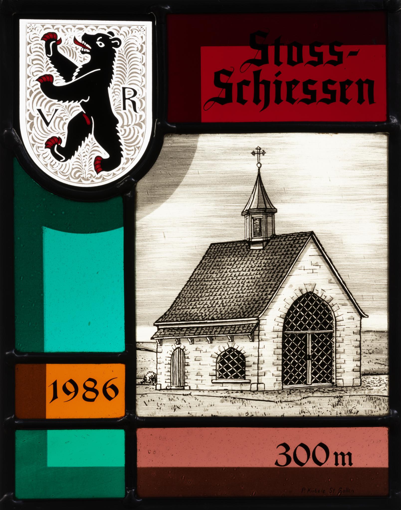 Das hochrechteckige Glasgemälde ist durch Bleistege in 7 unterschiedlich grosse Felder geteilt. Der Bereich unten rechts enthält auf bräunlich-rotem Grund die Angabe der Distanz (300 m) sowie die Signatur. Das grosse Bildfeld darüber zeigt die Schlachtkapelle von Stoss (Kanton Appenzell-Ausserrhoden), monochrom mit Schwarzlot auf farblosem Glas. Darüber im roten Bildfeld wird die Schützenscheibe bezeichnet (Stoss-Schiessen). Links davon in der oberen Ecke ist das Wappen von Appenzell-Ausserrhoden zu sehen. Darunter folgt ein leeres grünes Bildfeld, die Jahresangabe auf orange-farbenem Glas sowie ein weiteres grünes leeres Bildfeld.