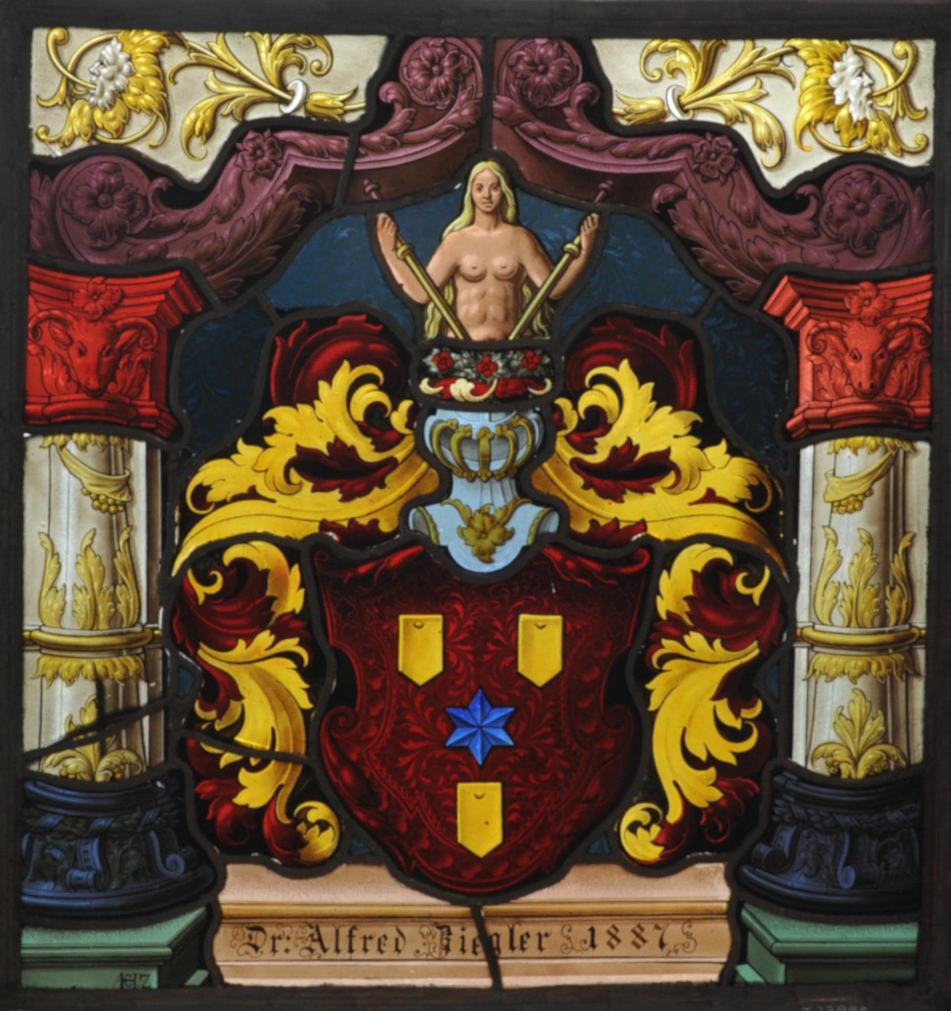 Dargestellt ist innerhalb der Säulenarchitektur das Vollwappen von Alfred Ziegler, darüber die Helmzier, seitliche Akanthusranken und eine unbekleidete, weibliche Halbfigur, die in jeder Hand einen Stab hält.