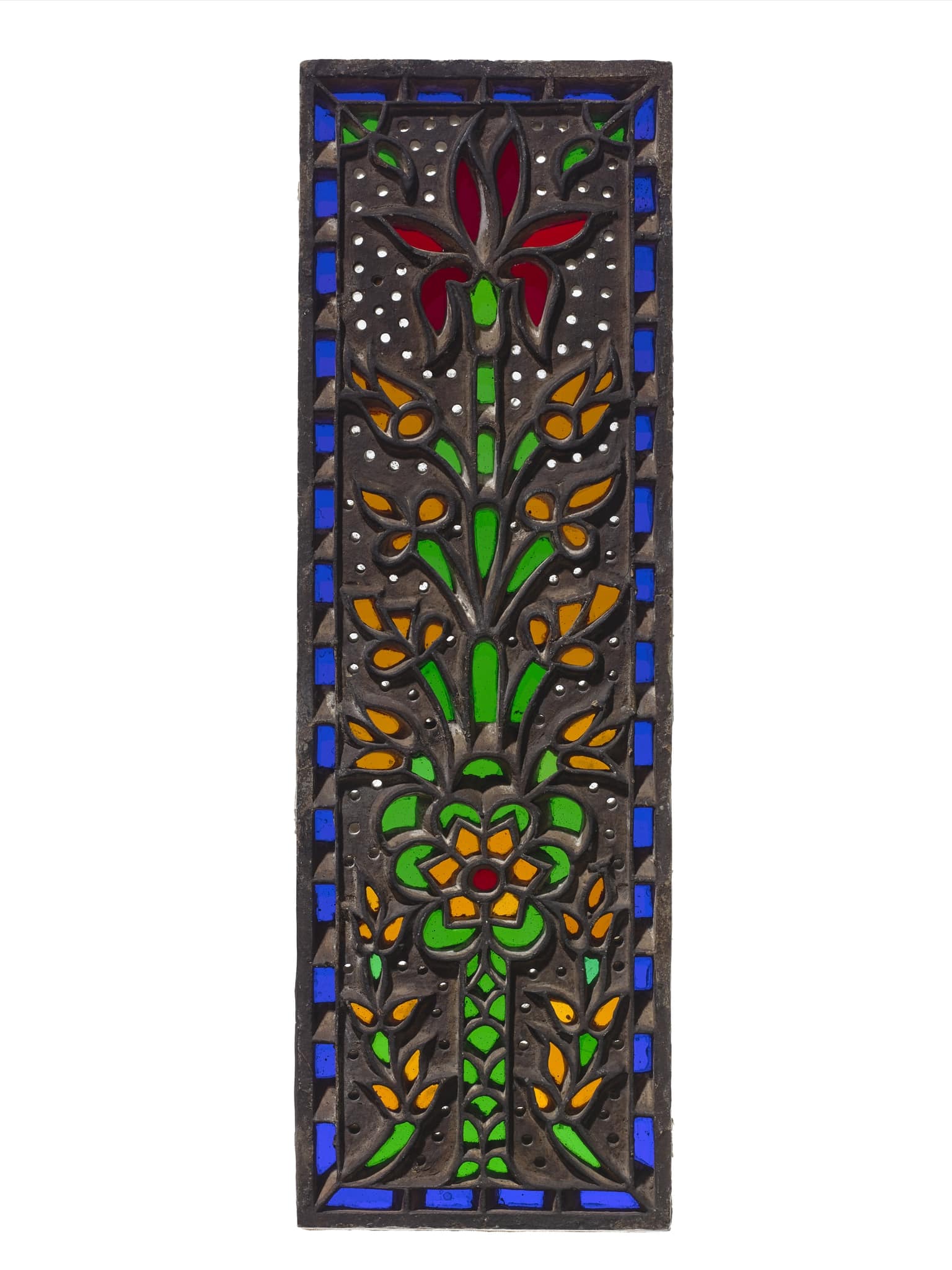 Oblong stucco and glass window showing a tree with nine symmetrically arranged sprouting branches within a blue frame. Apart from the central lily in red, it is not possible to identify the specific species of the other flowers. The trunk, backed with green glass, shows a geometric subdivision. A six-petalled blossom marks the transition from the trunk to the branches. Two flower stems with yellow blossoms spring from the lower corners and flank the trunk. The tree is worked out in relief against a perforated background, which is slightly recessed.