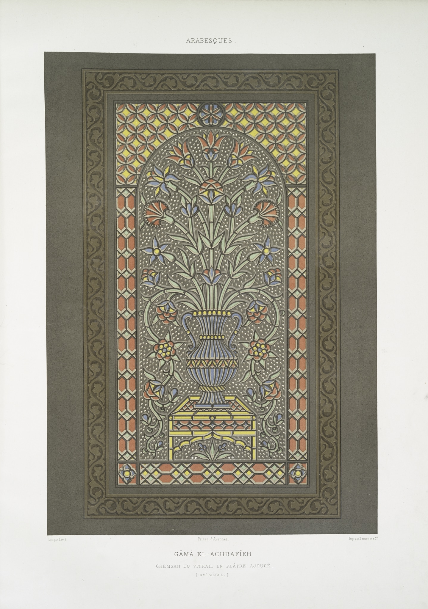 The window depicted was reconstructed from fragments. Prisse d’Avennes explains that he had been able to buy in Paris three boxes with fragments of six stucco and glass windows from a mosque in Egypt. In 1867, these windows had been sent from Egypt to the world’s fair in Paris, but had not survived the journey and therefore arrived there in pieces. Prisse d’Avennes succeeded in reconstructing two windows (Prisse d’Avennes, 1869–1877, vol. 1, pp. 154, 278, vol. 3, pl. CXLV; Keller, 2020, p. 31).
