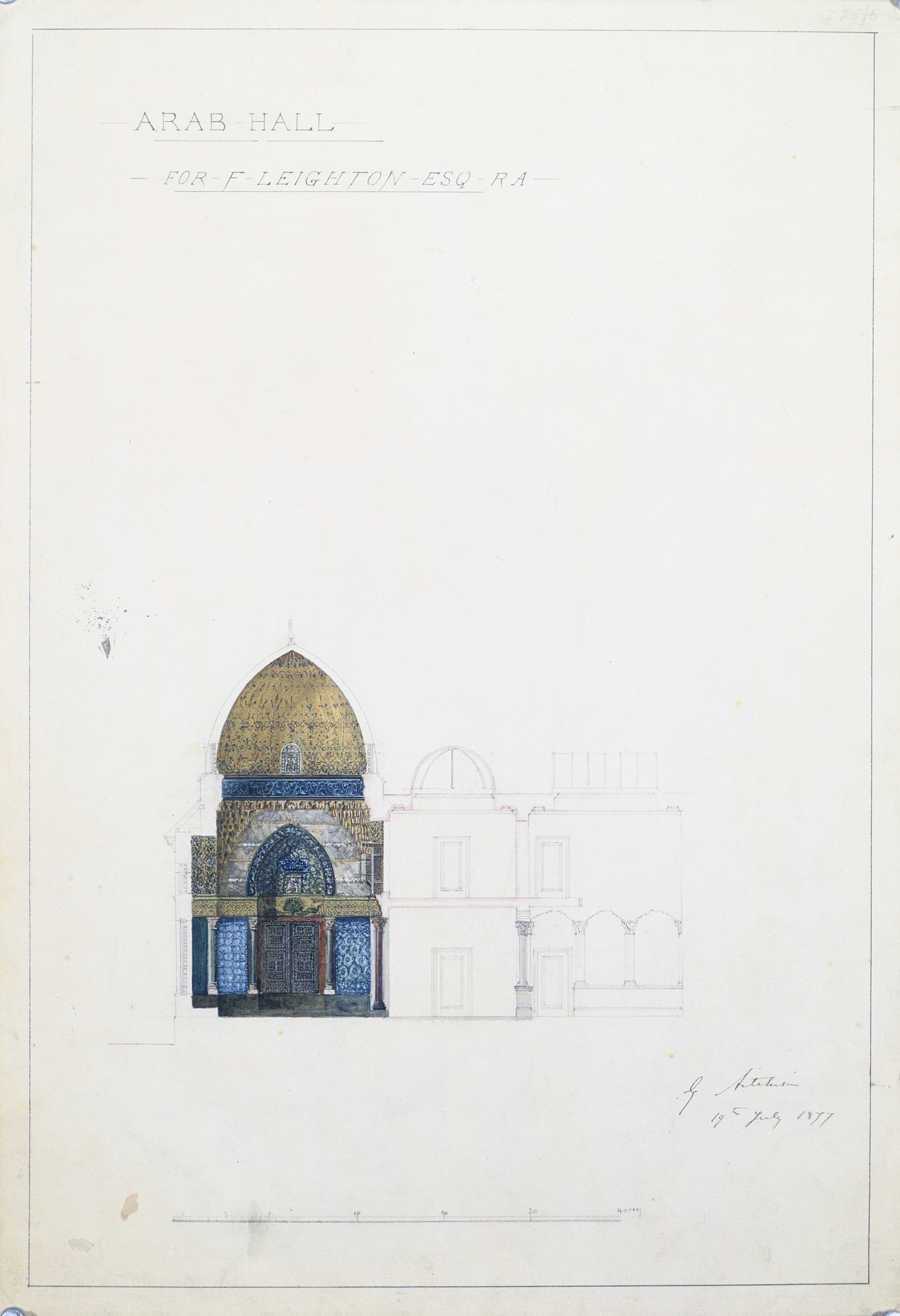 Presentation drawing showing the elevation of the west wall of the Arab Hall of the studio-house of the Victorian artist and collector Frederic Leighton (1830–1896) at 12 Holland Park Road in Kensington (London). Leighton House was constructed between 1865 and 1895 in five phases after plans by one of Leighton’s close friends, the British architect George Aitchison (1825–1910).