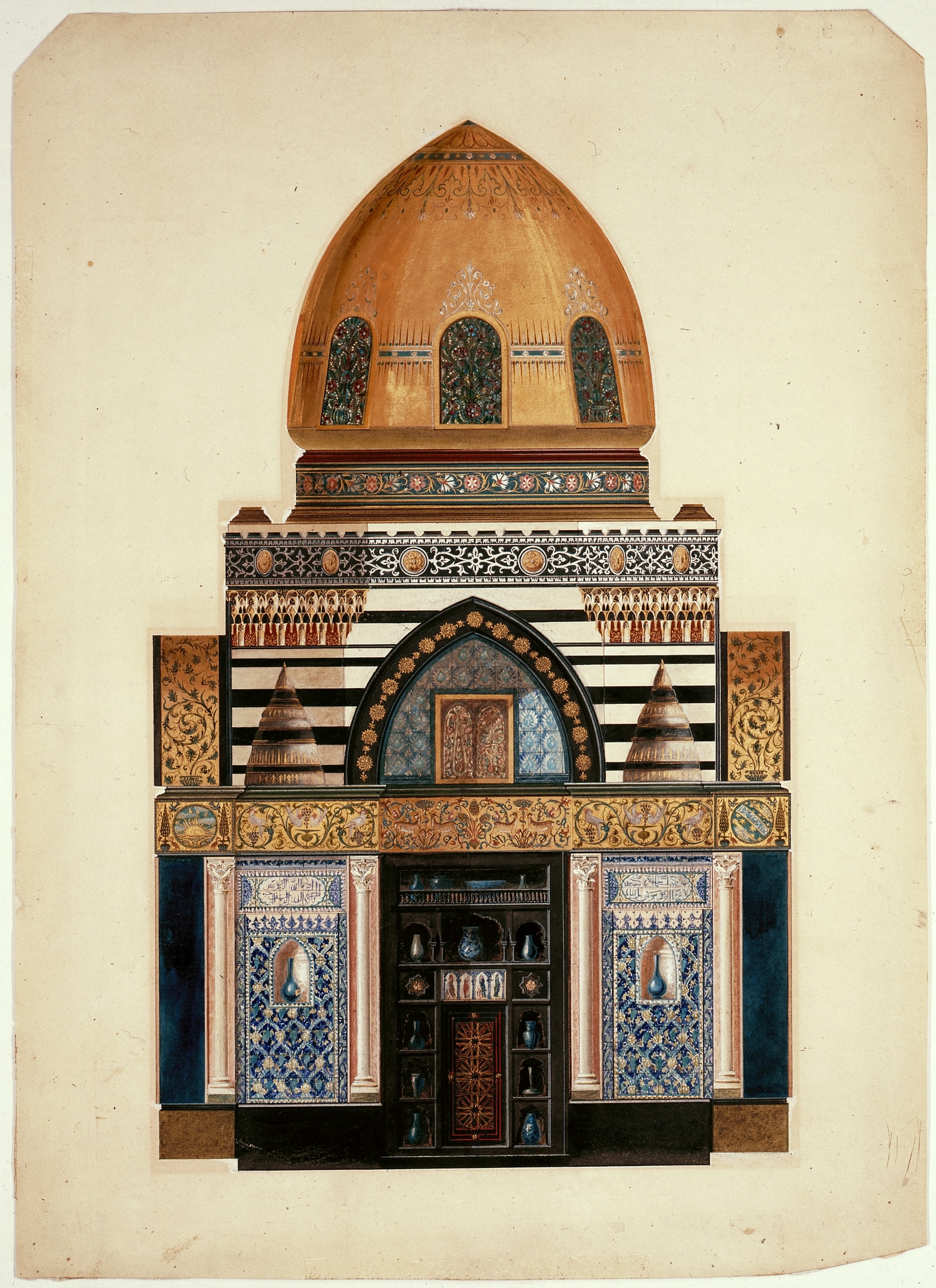 Presentation drawing showing the elevation of the west wall of the Arab Hall of the studio-house of the Victorian artist and collector Frederic Leighton (1830–1896) at Holland Park Road in Kensington (London). Leighton House was constructed between 1865–1895 in five construction phases after the plans of one of Leighton's close friends, the British architect George Aitchison (1825–1910).