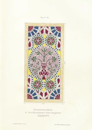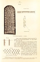To illustrate the description of the manufacturing of stucco and glass windows, Julius Franz publishes a vertical and a horizontal section through a window. It shows the typical oblique carving of the stucco panels and the direction of the light as it enters. As Franz describes, this way of cutting serves to ensure that the colourful design of the windows, which are often installed high up, is not obscured by the stucco lattice. A second illustration shows a copper mesh, which protects the windows on the outside.