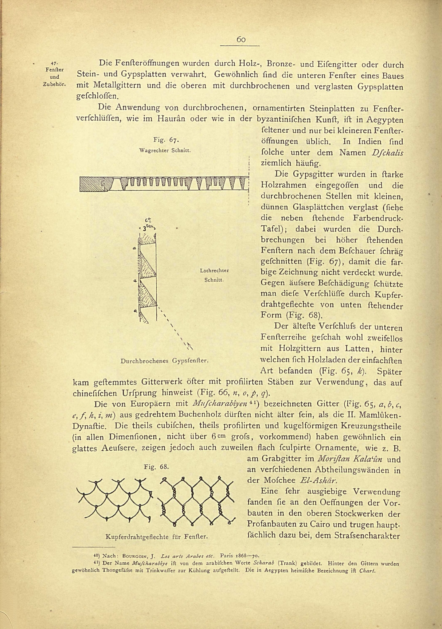 Page with illustrations in Julius Franz, Die Baukunst des Islam, 1887, p. 60, fig. 67. The illustrations show the technique for cutting the stucco profiles of stucco and glass windows.