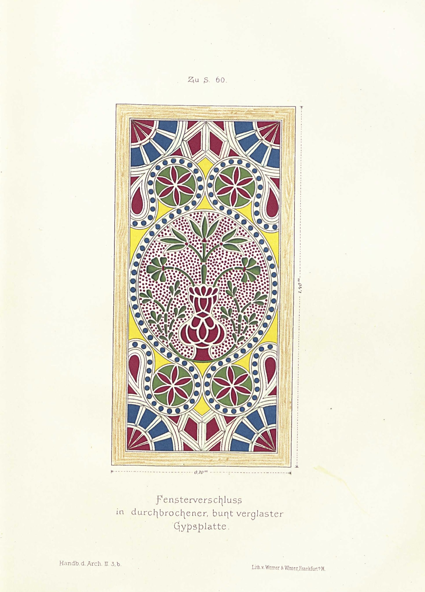 The lithograph, made by the publishing house Werner & Winter in Frankfurt a. M., shows an unusual colouring: the perforated background to the medallion is commonly covered with colourless glass (see for example IG_169), and not with red glass as in the plate. It is not possible to determine whether the original window actually had red glass behind the perforations, or whether this is a modification within the print, as the photograph is in black and white.