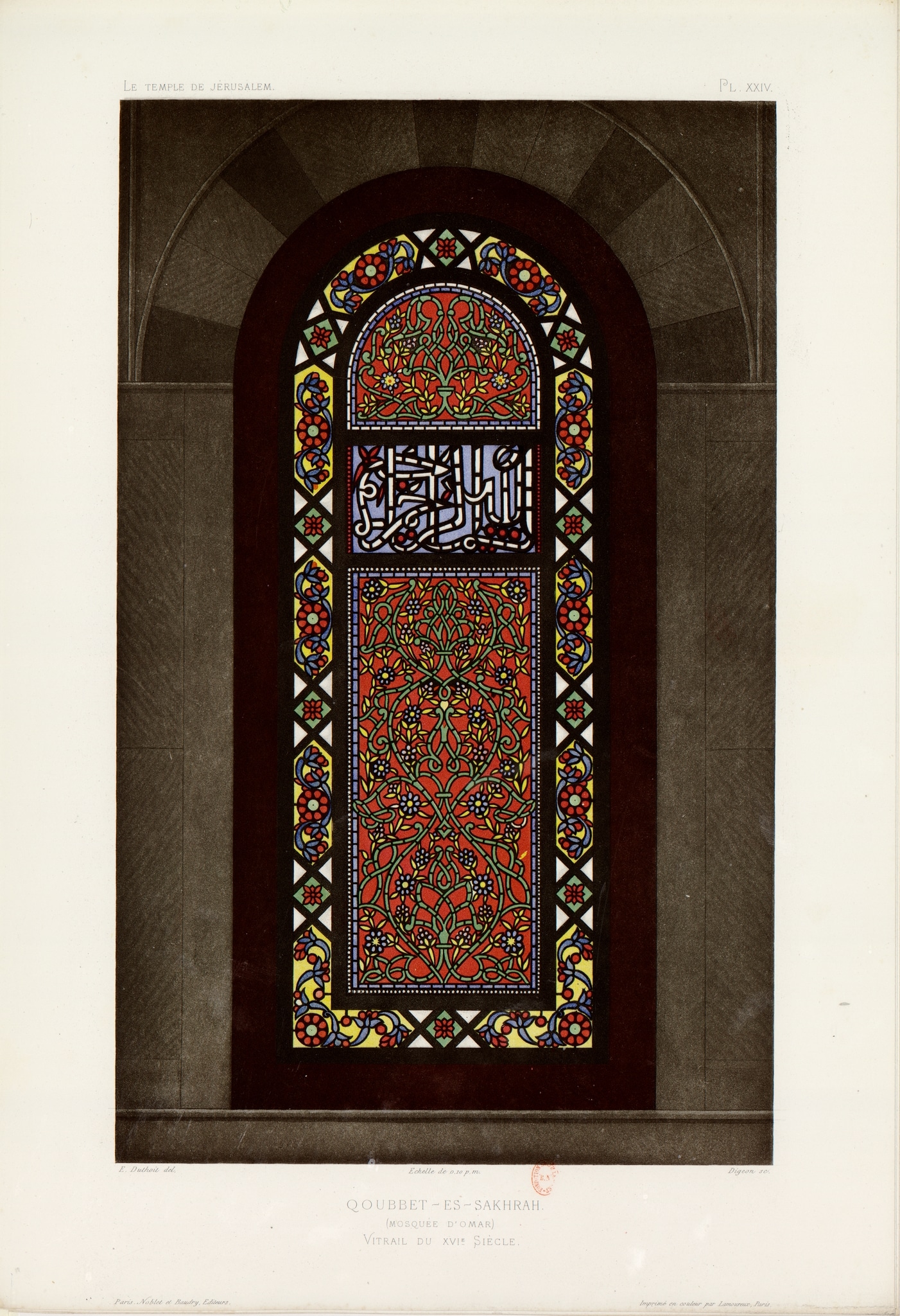 De Vogüé indicates that the windows are shown at a scale of 1:1000. Furthermore, in comparison with a more recent copy of the octagon window, now in the Haram Museum in Jerusalem, Flood was able to specify the measurements of the original windows: about 325cm by 109cm (345cm by 128cm with the wooden frame). The epigraphic field, measuring 70cm by 37cm, is delineated with a thick border of stucco tracery about 2.5cm wide. The lower rectangular field measures 30cm by 27cm. The outer border, consisting of ovoid cartouches separated by medallions or rhomboids, is 20cm wide (de Vogüé, 1864, p. 96; Flood, 2000, p. 435).