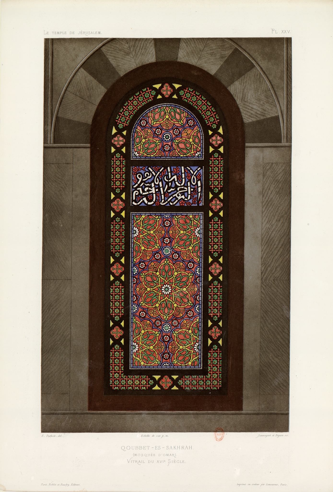 The three stucco and glass windows illustrated by Melchior de Vogüé were previously in the octagon of the Dome of the Rock in Jerusalem. The qamariyya depicted here was formerly in window 3 of the octagon. It bears a line of the second Sura: [there is no God but He, the Most Merciful, the Most Compassionate: Sura II,163–64].
