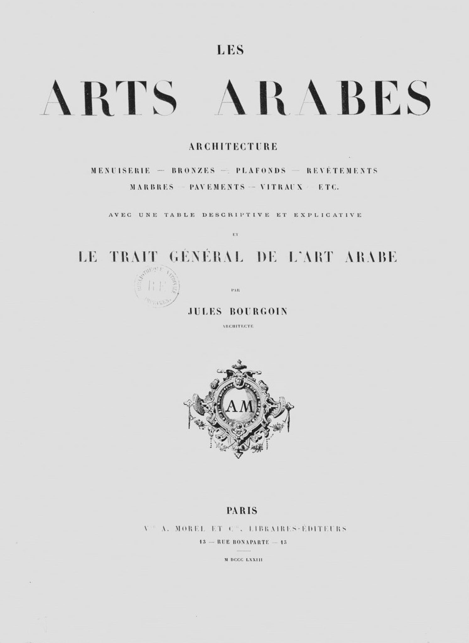 Bideault, M. (2012). Les Arts arabes ([1868]-1873) In Jules Bourgoin (1838-1908) : L’obsession du trait [en ligne]. Paris: Publications de l’Institut national d’histoire de l’art. Retrieved from https://books.openedition.org/inha/4586.