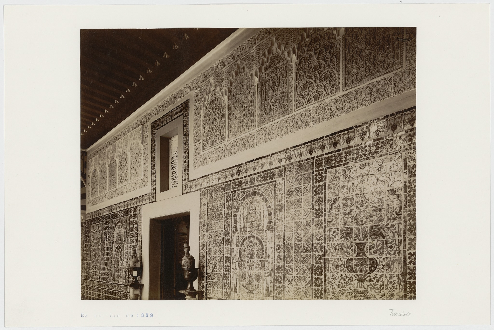 The rear of the window visible in this photograph, together with a photograph of a stucco window reproduced in Saladin’s Tunis et Kairouan (IG_249), which may illustrate a window made for the Exposition Universelle of 1889, support the assumption that windows of the same typology as seen in earlier Tunisian representations at world’s fairs were shown at later fairs. Stucco and glass windows with geometric patterns based on stars under arches and non-perforated spandrels were displayed at the Great Exhibition in London in 1851 (IG_410), at the Exposition Universelle in Paris in 1867 (IG_271, IG_273), as well as at the International Colonial Exhibition in Amsterdam in 1883 (Victoria and Albert Museum, 1277-1883). In addition to the window from the Amsterdam Colonial Exhibition preserved at the Victoria and Albert Museum in London, several windows of this typology that entered the collection of the Orientalische Museum (now in the MAK Vienna) in the 19th century (IG_362, IG_363, IG_364, IG_365, IG_366, IG_367, IG_368) demonstrate the availability of this type of stucco and glass window in 19th-century Europe.