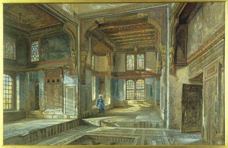 This interior depicted by Frank Dillon represents the mandarah in the ‘House of the Mufti’ in Cairo – so named because it was owned by the supreme mufti of Egypt, Sheikh Muhammad al-ʿAbbasi al-Mahdi (1827–1897) between 1847 and 1886 (Llewellyn, 1998, p. 154). During the 19th century, Europeans had become familiar with the term mandarah through Edward William Lane: ‘In general, there is, on the ground-floor, an apartment called a mun’dar’ah, in which male visitors are received’ (Lane, 1836, p. 11). According to Mercedes Volait, the ‘House of the Mufti’ was built at the beginning of the 18th century, between 1704 and 1705 (a date that can be found on a column in the residence) and had been given to Sheikh al-ʿAbbasi when he became Grand Mufti in 1848 (Volait, 2021, p. 119). Dillon travelled to Egypt several times in the 1850s to the 1870s and visited the house while he was in Cairo (Thomas, 2013, pp. 59–60). One of his drawings of the house is dated 26 December 1873 (Victoria and Albert Museum, 856-1900).