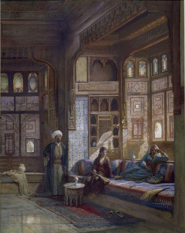The gouache A Room in the House of Shayk Sadat, Cairo (also known as Kaah in the Harem of Sheykh Sadat, Cairo), which was painted around 1875 by the British painter Frank Dillon (1832–1908), depicts a genre scene in an interior (qāʿa) in Cairo. It represents a so-called ‘harem scene’ in the ‘house of Shayk Sadat’. Two women sit on a divan in a recess: one holds a fan made of peacock feathers in her hand, the other a plucked instrument, while a man with a turban leans against the wall. The interior contains components of painted and carved wood, stone, and blue and white tiling, as well as a prayer rug and a wooden table. Wooden screens are depicted in the lower part of the wall, and coloured-glass windows with geometric ornament can be seen in the upper part. Four windows on the right-hand side have geometric ornament with pieces of glass in green, yellow, orange, and white. Three other windows, depicted in the niche on the left side, also have a geometric design, with blue, yellow, green, and white glass.