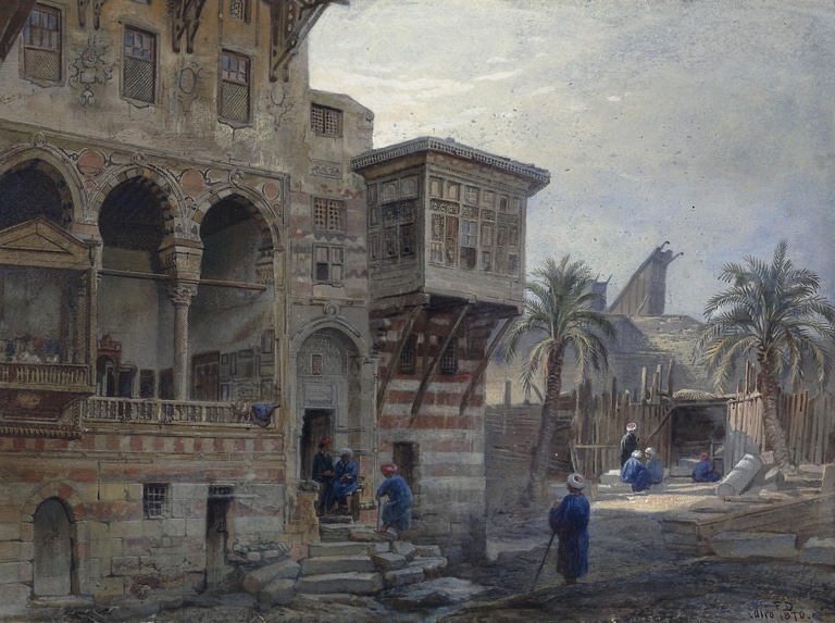This house depicted by the British painter Frank Dillon was one of several structures built by the influential emir Radwan Bey in the mid-17th century (Llewellyn, 1998, p. 154). Radwan was a Mamluk bey and the leader of a faction known as the faqariya: he dominated political life in Cairo from 1631 to 1651. For twenty-five years, he held the post of amir al-hajj, commander in charge of the annual pilgrimage to Mecca (Williams, 2008, p. 106).