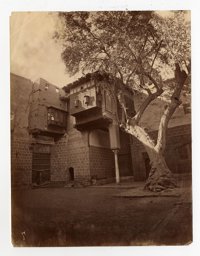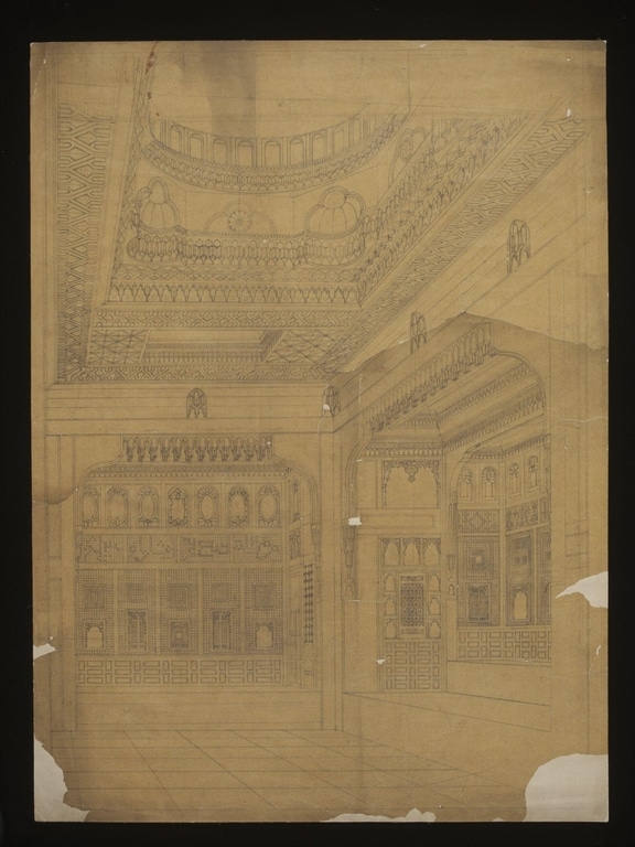 The Drawing of the House of Sheik Sadat, Cairo by the British painter Frank Dillon (1832–1908) depicts a genre scene in a reception chamber (qā*ʿa), with the wooden lattices of an oriel (mashrabiyya*), as well as stucco and glass windows with geometric motifs.