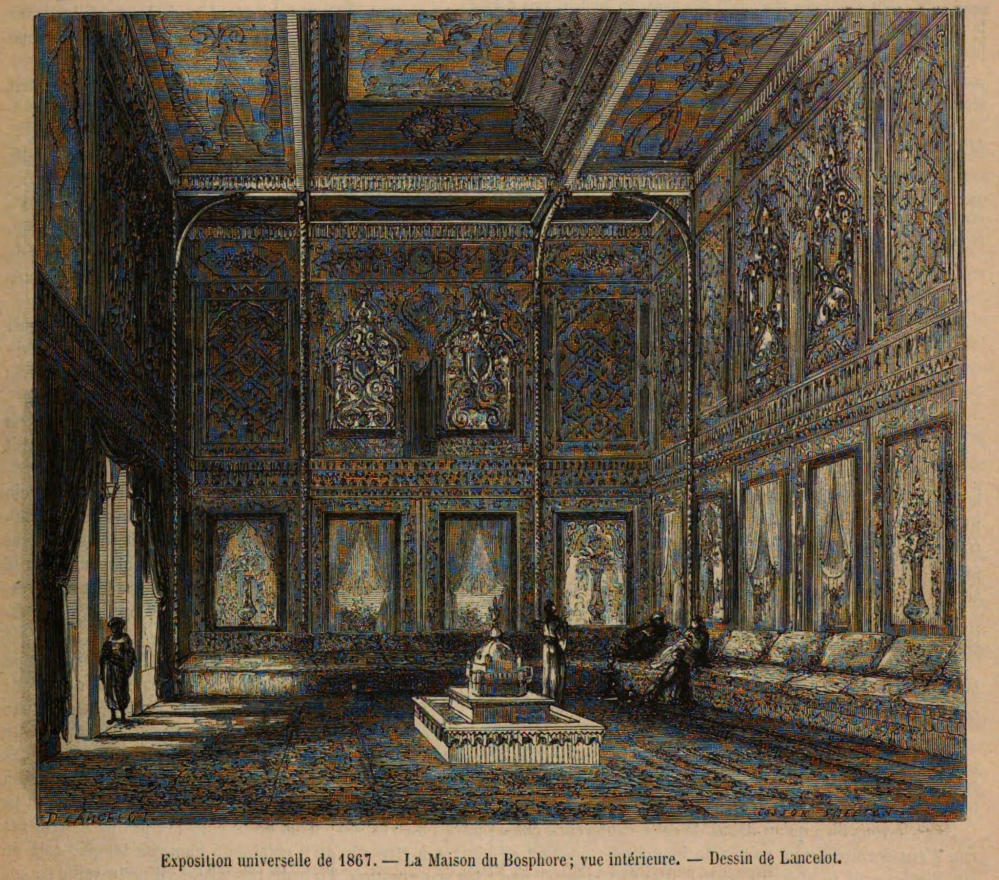 This monochrome illustration shows the interior of the Maison du Bosphore, also called Pavillon du Bosphore, which was one of the Ottoman pavilions at the 1867 Exposition Universelle in Paris. The print, based on a drawing by Lancelot, was published on page 389 of the journal Le Magasin pittoresque, edited by Édouard Charton, accompanying an anonymous article entitled ‘Exposition Universelle De 1867. La Maison Du Bosphore’.