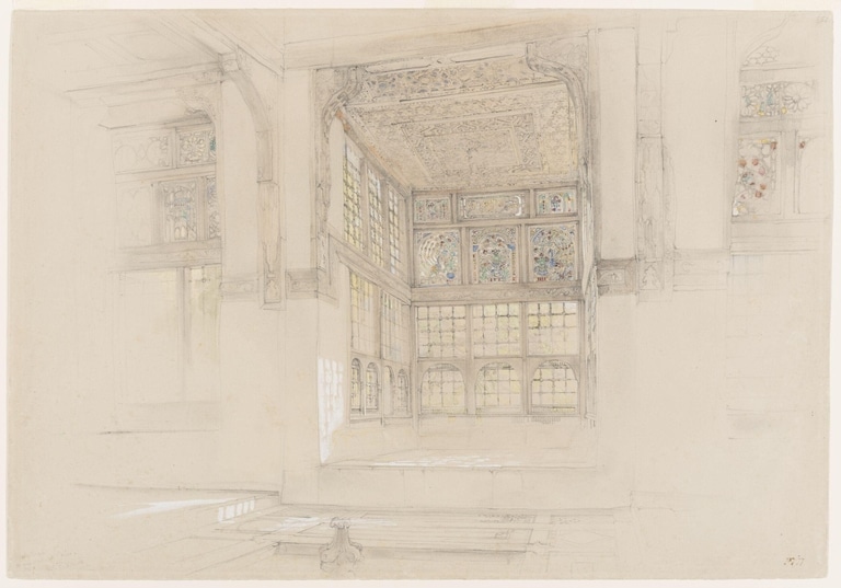 A section of the interior drawn by the British architect James William Wild (1814–1892) (IG_449), in which the windows closely correspond in their motifs and arrangement to Lewis’s watercolour, also shows a central window with stylized architecture. A window with geometric design can however be seen in the recess on the right side of Lewis’s and Wild’s watercolours. In a pencil note on his watercolour drawing, Wild confirms that the interior represents the Cairene house in which Lewis lived by himself during his sojourn in Egypt for almost ten years (Weeks, 2014, 40–43). The discrepancies regarding the windows in Lewis’s and Wild’s watercolours, done in Egypt, compared with Lewis’s oil painting, done after his return to Britain in 1851, suggest that the latter is not a totally authentic and accurate rendering of the Cairene house in which Lewis lived during in the 1840s, the period during which the watercolours were produced (Tromans, 2008, pp. 129–132).