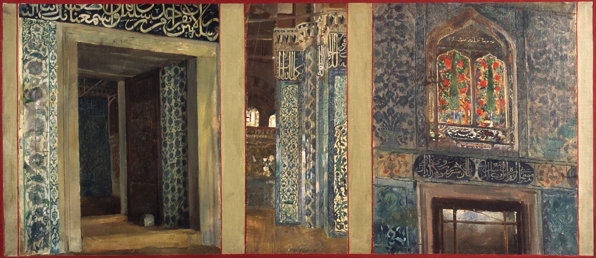 Three studies by the French Orientalist painter Paul Alexandre Alfred Leroy (1860–1942) of the Yeni Cami in Istanbul. The third shows an interior with two stucco and glass windows with the motif of a stylized cypress tree.