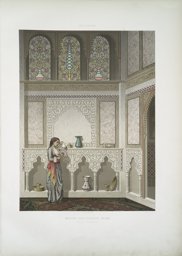 Ernst also depicted windows of this type, with stylized flowers symmetrically disposed in a green and red vase, in other Orientalist paintings: in Au harem (IG_153), three coloured stucco and glass windows are depicted in a recess, two of which show the motif of stylized vases of flowers. Another example is Ernst’s painting Tending the Lamp (oil on panel, 61 × 48cm, Sotheby’s (2018): The Orientalist Sale (Sale L18100), 24 April 2018, London, lot 14), where two windows with the motif of stylized flowers in a green and red vase are represented on the left side of the painting. Two stucco and glass windows with the motif of symmetrically arranged flowers in a red and green vase can be seen in a chromolithograph by Émile Prisse d’Avennes (IG_31) that, according to the caption, represents the upper room of the Cairene house of ‘Sidi Youçouf Adami’. The impact of Prisse d’Avennes’s chromolithograph cannot only be seen in works by Rudolf Ernst, but also in the painting Rüstem Pasha Mosque Istanbul by Jean-Léon Gérôme (IG_149).