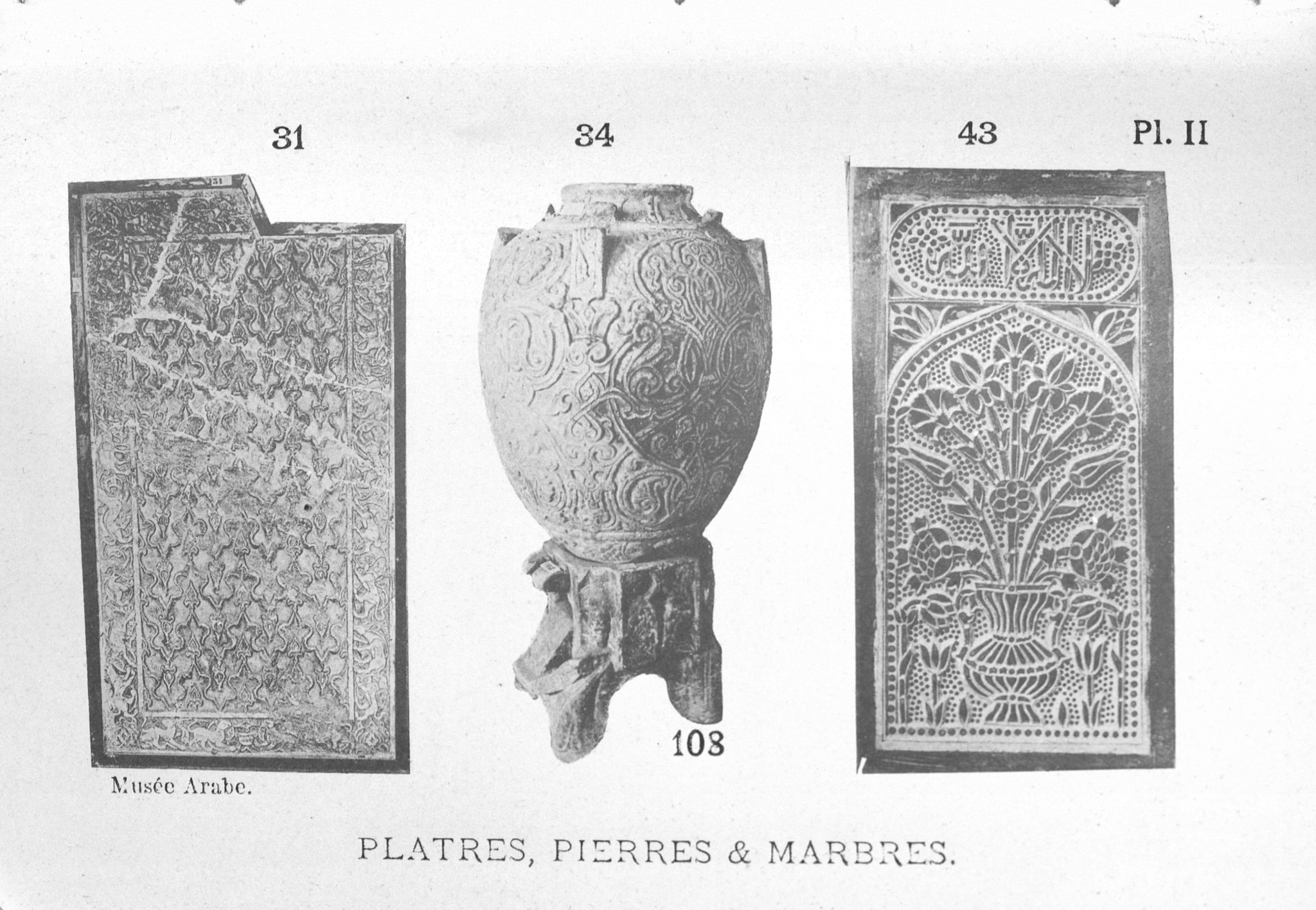 Herz does not directly comment on the stucco and glass window illustrated (it has the number 43, but the caption under this number refers to a different object). The specimen, showing a vase, is still preserved in the Museum of Islamic Art in Cairo (387/2). The same window was published by Julius Franz in 1903 (p. 115) and by Henri Saladin and Gaston Migeon in 1907 (vol. 2, p. 369). The photograph was taken by the photographer Gabriel Lekegian (IG_480). Migeon dated the stucco and glass window to the 8th–9th centuries AH / 14th–15th CE, without detailing his arguments. Today in the museum the window is dated to the 11th–12th centuries AH / 17th–18th. The motif of a vase was used in Cairo from the beginning of the Ottoman period in the 10th century AH / 16th CE (Flood, 1993, p. 171; see the specimens from the 13th century AH / 19th CE, IG_1; Victoria and Albert Museum, London, 223/1894). Since no information is available on the origin of the window, its date cannot be further narrowed down.