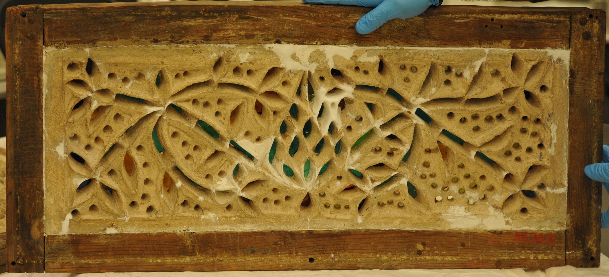The latticework was carved into an elongated, rectangular stucco panel and inlaid with colourless and coloured sheet glass. The pieces of glass are fixed onto the back of the lattice with a 1–1.5mm-thick layer of gypsum plaster. To prevent the pieces of glass from being displaced while pouring the embedding stucco, they were fixed to the latticework with an adhesive. Traces of this animal or vegetable glue are visible in the area around the openings.