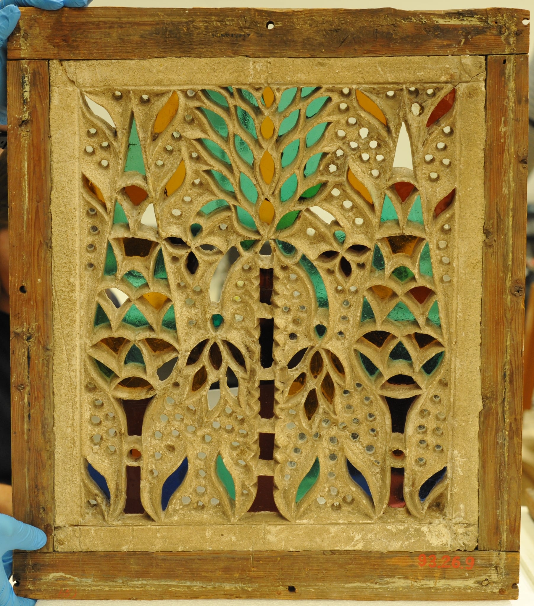 This stucco and glass window is one of the few examples preserved in Western museum collections representing a palm tree. Several windows of this type are preserved at the Victoria and Albert Museum in London, among them ME.3-2005, MES.LOST.25, MES.LOST.34, and C.157-1932. It was produced according to the traditional method used in the manufacture of qamariyyāt in North Africa to this day (see Technique).