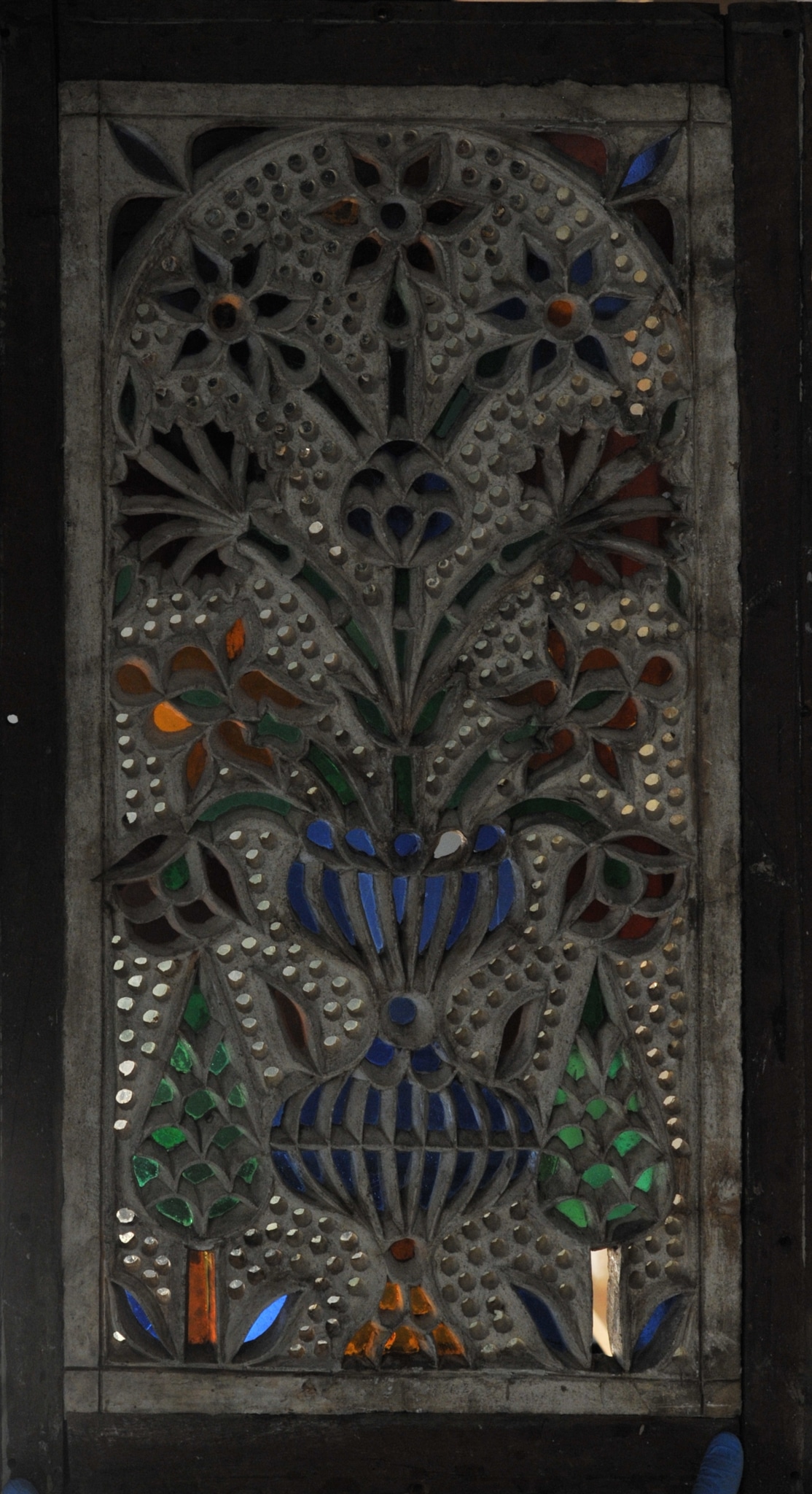 The flowers-and-vase motif of this stucco and glass window differs from other qamariyyāt of the same type owing to the addition of two cypress trees. The design is of comparatively high quality, as individual flowers can be recognized.