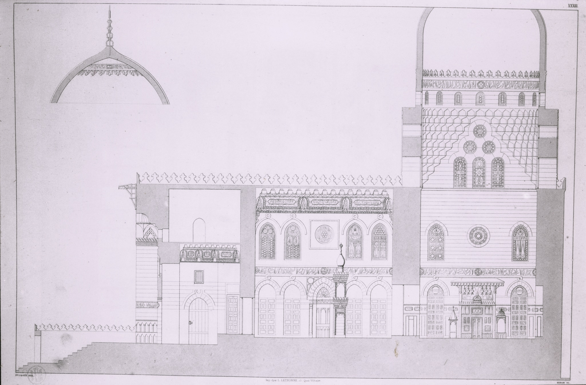 Pascal Coste’s plates are based on the extensive documentation he made in Cairo between 1818 and 1827. The French architect was able to study the funerary complex of Sultan Qaytbay (877–79 AH / 1472–74 CE) in 1822 (Volait, 1998, p. [3]). His coloured plate XXXV shows the qibla wall from a distant view-point.
