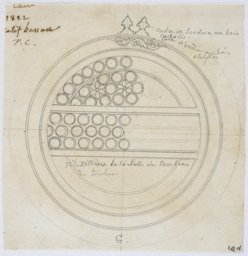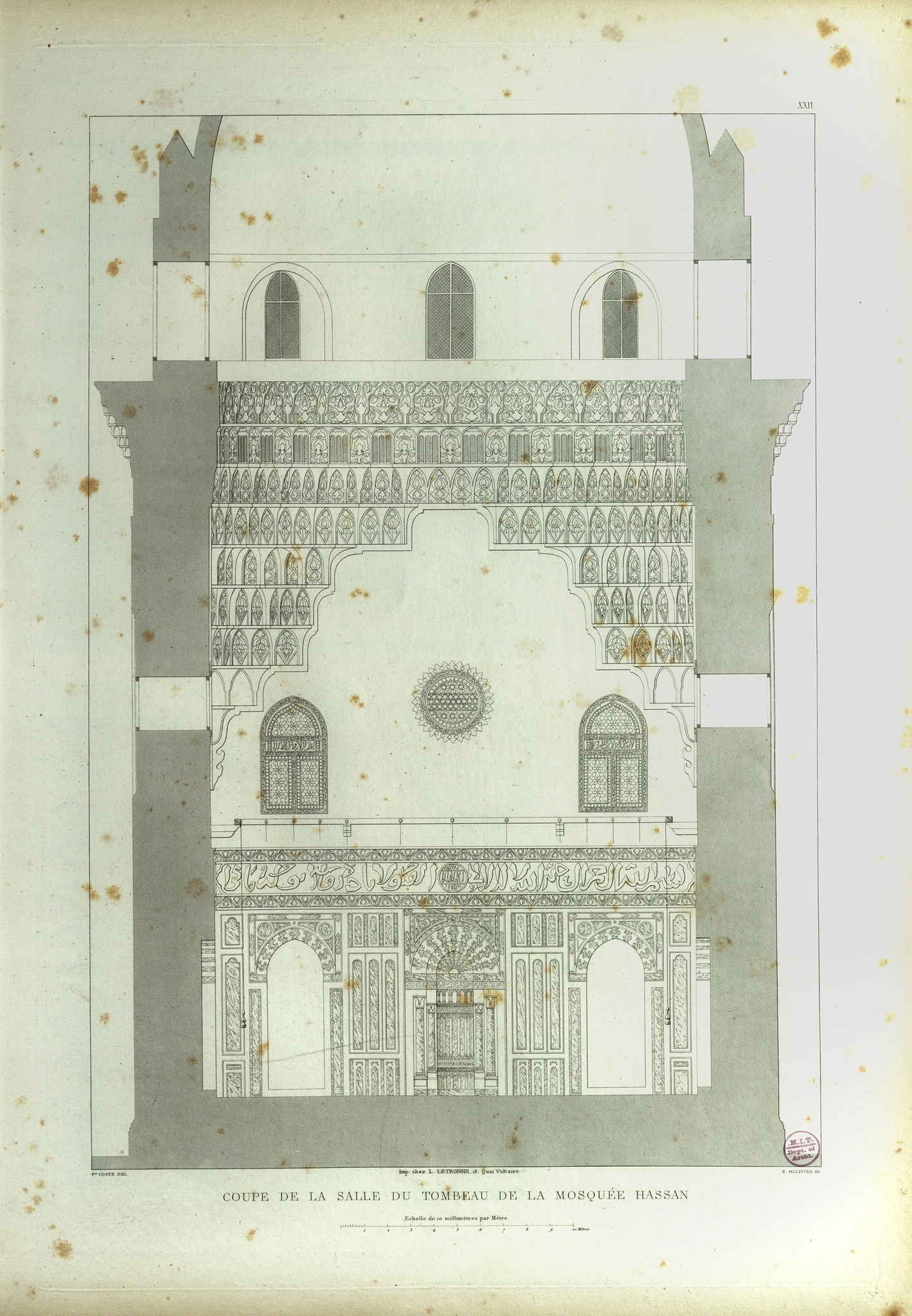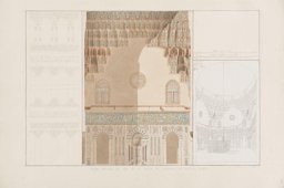 Pascal Coste’s plates are based on the extensive documentation he made in Cairo between 1818 and 1827. The Sultan Hasan Mosque is presented in six plates. In the text, Coste (p. 37) only comments generally about the building, without mentioning the stucco and glass windows. But, as three preparatory works show, he did pay them particular attention. One pencil drawing, dated 1822, shows the circular window in detail and a second pencil drawing the pointed window. The latter has indications of the colours of the pieces of glass: white (blank), green, yellow, and red (IG_294, IG_295). Finally a watercolour (Victoria and Albert Museum, SD.272:14, IG_130) shows the qibla wall of the Sultan Hasan Mosque with a light colouring that corresponds only approximately to the colour indications of the drawing. So, for instance the blank round pieces of glass indicated appear in a reddish colour in the watercolour.