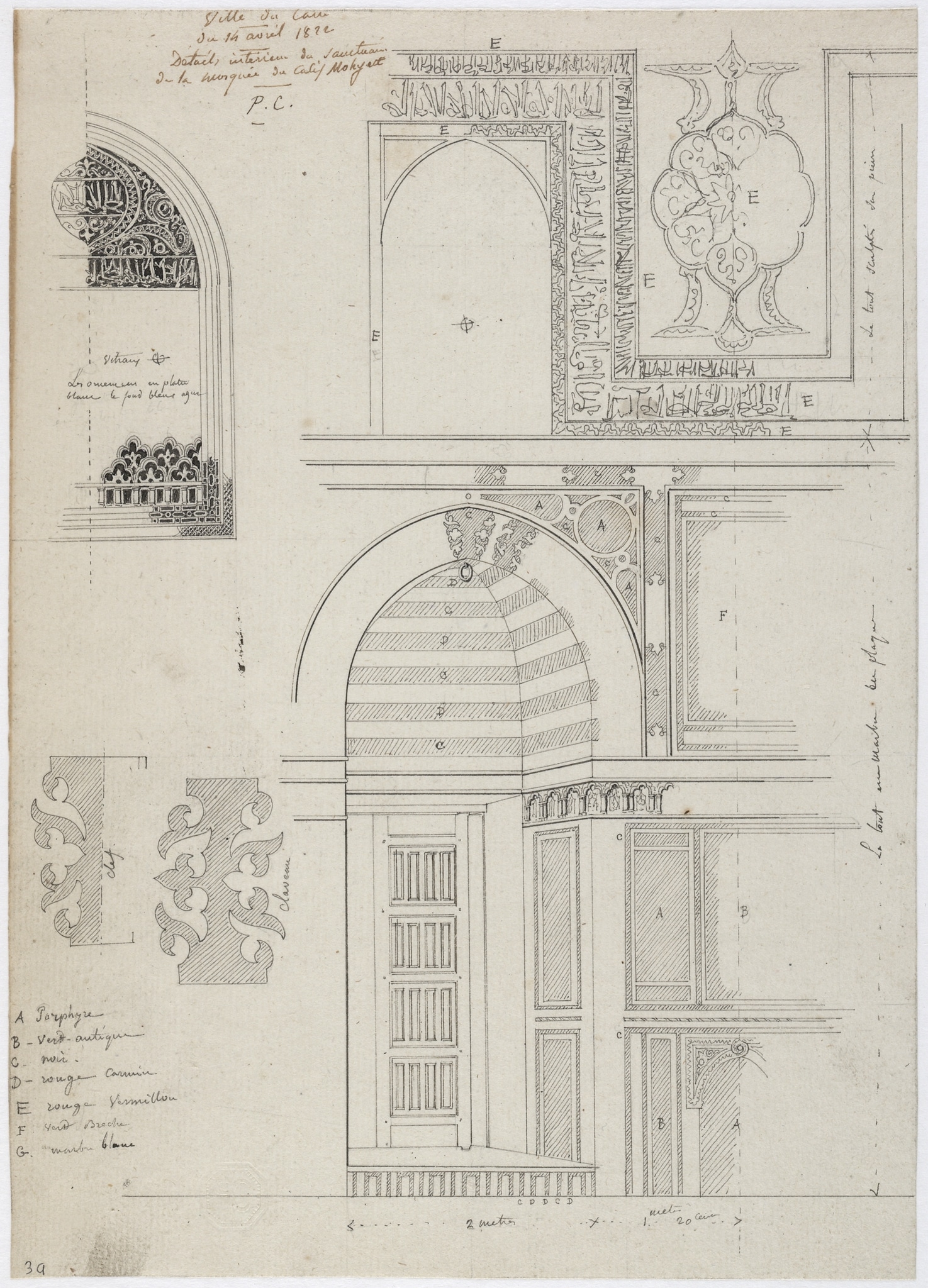 This drawing shows the qibla wall of of the Mosque of Sultan al-Muʾayyad in Cairo. To the left, the pointed arch window located in the centre of the wall is duplicated in enlarged form. The window is divided by a horizontal band with an Arabic inscription. Above it a medallion with a second inscription is surrounded by a floral pattern. The lower field shows a sebka pattern (drawn only in the right corner).