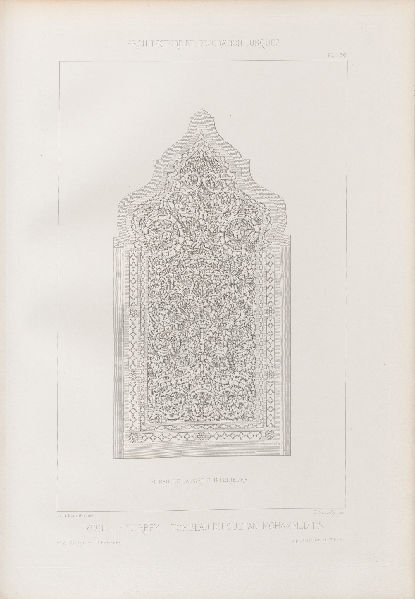 Fig. 36 in Léon Parvillée, Architecture et décoration turque au XVe siècle, Paris: A. Morel et Cie, 1874. A black and white print showing a polylobed arched stucco and glass window, depicting the stucco grille, not the pieces of glass. The stucco lattice is drawn in great detail, showing the oblique carving and the different levels of the surface. The tendrils and palmettes have a broader stucco profile, while the leaves and flowers within these tendrils are formed by a thinner one. In addition, thinner stucco pieces within the tendril outlines create a discreet division into small sections. They were not placed there for aesthetic reasons: they made it possible to fix on the back pieces of glass so small that they did not need to be cut into the curved shape of the tendril.