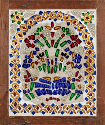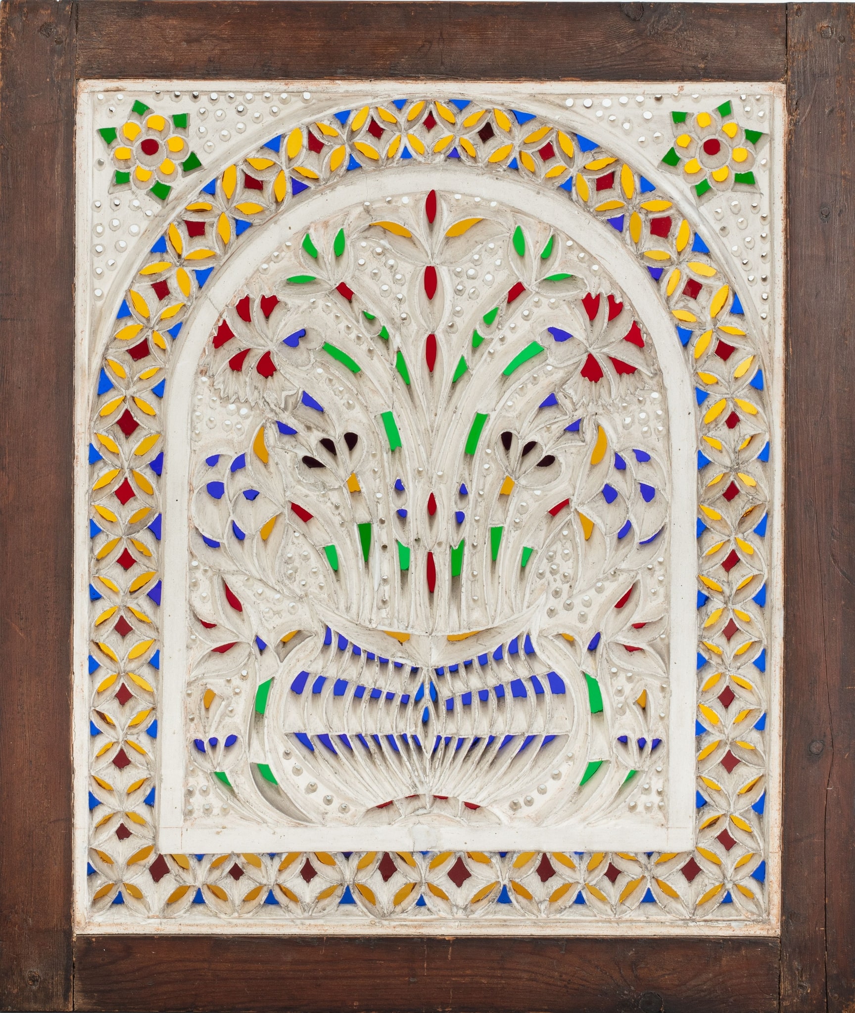 Nine flowers in a blue vase are arranged symetrically along a central axis. Despite the stylization of the flowers, carnations, lilies, and roses are easily recognizable. The vase is flanked on each side by two flower stems, springing from the bottom of the central field. An elaborate semicircular frame composed of four-petalled flowers backed with pieces of yellow glass surrounds the central motif. Six-petalled flowers within a six-pointed star are set in the spandrels. The main representation and the flower and star motif in the spandrels are set within a perforated background, which is slightly recessed.