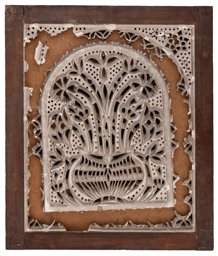 The window discussed here stands out from other qamariyyāt of the same type, owing to its elaborate semicircular frame. It forms part of a group of four qamariyyāt acquired by the French industrialist and art collector Émile Étienne Guimet (1836–1918). All four windows became part of the collection of the Musée Guimet, founded in Lyon in 1879, and are today conserved at the Musée des Beaux-Arts (IG_254, IG_255) and the Musée des Confluences (IG_256, IG_257) in Lyon. Whereas IG_254 and IG_257 show identical compositions of curlicues and flowers, this qamariyya as well as IG_256 (held at the Musée des Confluences) represent late versions of the flowers in a vase motif.