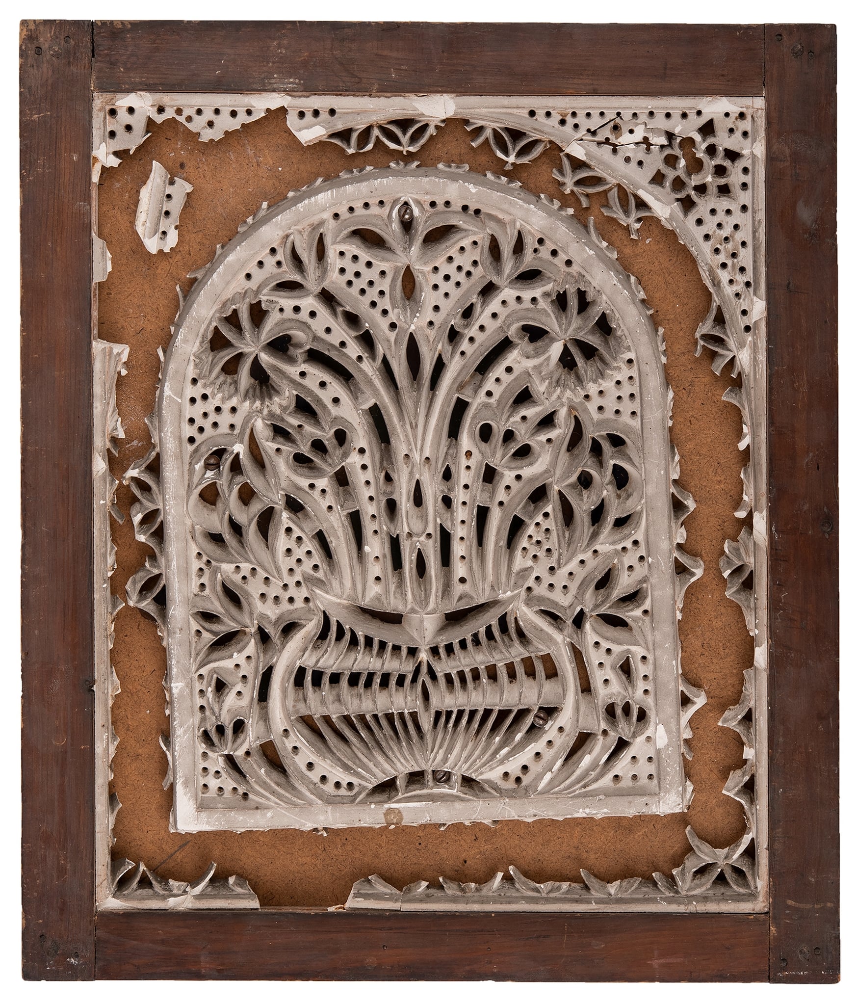 Unfortunately, there is no information on the place of acquisition, the date, or the provenance of the four windows. Despite its poor state of preservation, the stucco grille does not show any evident signs of weathering, suggesting that the window has never been exposed to the outside environment. We therefore assume that the window has never been part of a historic building in the Islamic World, but was produced specifically for the flourishing art market in the late 19th century and for use in the Arab-style interiors of Western collectors.
