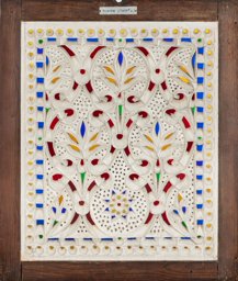 Latticework carved into a rectangular stucco panel with a thickness of 12–14mm and inlaid with colourless and coloured pieces of glass. The pieces of glass are attached to the back of the panel by a thin layer of gypsum plaster with a thickness of 0.5–1.5mm.