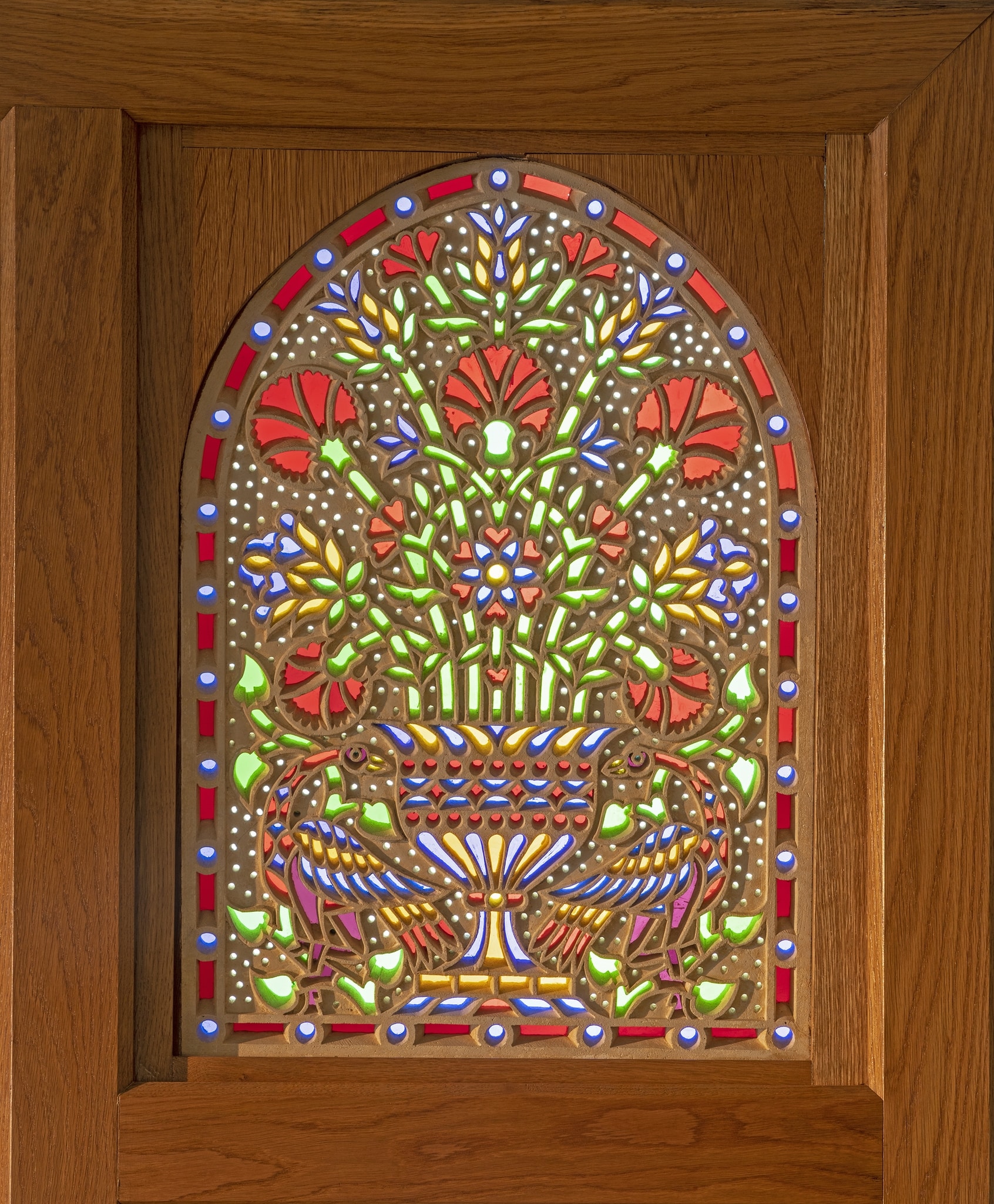 The design of this stucco and glass window consists of a richly decorated vase with flowers. The vase is flanked by two colourful peacocks, which are surrounded by green tendrils. The flowers in the vase – roses, tulips, carnations, and an unidentified species – are arranged symmetrically along the central axis. The motif is worked out in relief against a perforated background that lies approximately 5mm below the surface of the stucco panel. It is surrounded by a slightly pointed frame composed of rectangles and circles in red and blue. In contrast to the usually harmonious design of Islamic windows with the same motif, the arrangement of the elements and the proportions of the motif to the background appear unbalanced here: the flowers nearly touch the frame and the vase, and the peacocks almost disappear against the evenly dotted background. Also, other features distinguish this window from comparable examples from the Ottoman period: for example, the combination of vase of flowers and peacocks together with the presence of foliage tendrils is unusual; in addition, the depiction of the centre carnation, which is supported by two inclined styles growing out of the two adjacent carnations, is atypical for the flower-and-vase-motif.