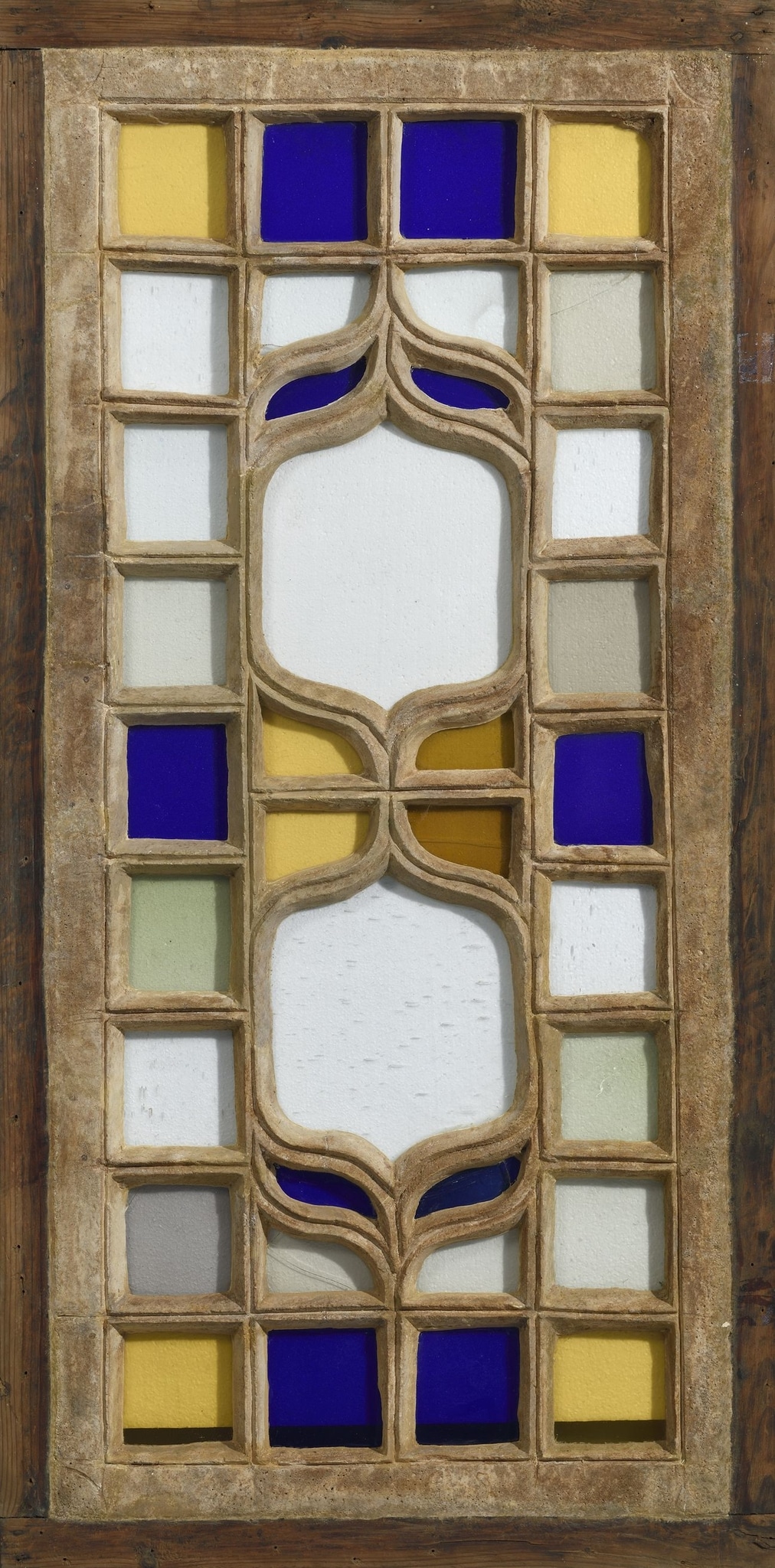 Latticework backed with colourless and coloured sheet glass. The delicate latticework was most likely produced by cutting the design out of a solid plaster panel following a template incised into plaster when it had not yet completely set. Traces of this process can still be observed, for example, in the corners of the panel. Some of the incisions, especially those set in the middle of the delicate stucco bars, seem to have a purely decorative function.