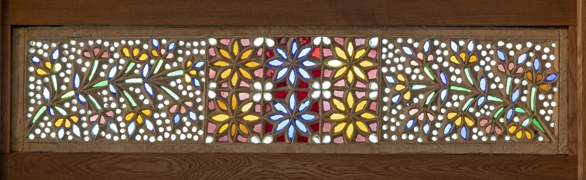 The design of the latticework has two levels: the main motif (level 0) has been carved out of the stucco panel with sharp, knife-like tools following a template incised in the surface of the panel. Traces of the incisions are still visible in some places on the front. The second level (level –1), which lies 7–10mm below level 0, shows irregularly spaced, conical perforations, which were pierced with a metal or wooden pin in the stucco before it was fully set. The holes are 10–15mm in diameter and slightly tapered towards the back. The distance between the holes is 1–10mm. All holes are backed with colourless glass.