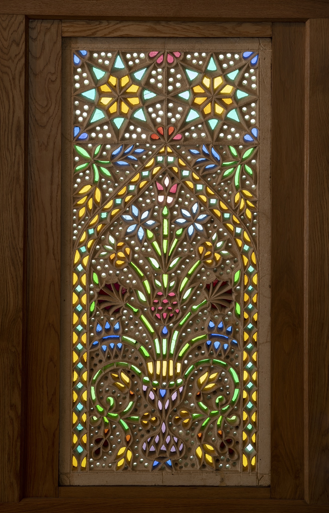 Latticework carved into a rectangular stucco panel and inlaid with colourless and coloured sheet glass. The pieces of glass are fixed on the back of the lattice with a thin layer of gypsum plaster. The average thickness of the stucco panel is approximately 22mm. The stucco panel was cast in a wooden frame.