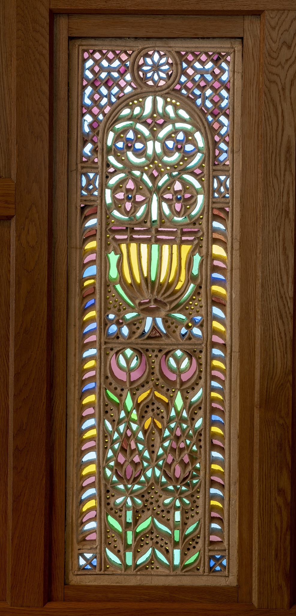 This stucco and glass window, which has a largely identical counterpart in IG_355, also held at the Benaki Museum of Islamic Art, stands out from most of the examples studied. Although it combines two of the most common motifs of stucco and glass windows, it differs significantly in the way these motifs are represented. The cypress trees (in the lower half of the window) are not entwined with tendrils as is usually the case in windows with this motif. The flowers-in-a-vase motif (upper half) differs from the standard representation in that the vase does not contain a bouquet composed of different flowers, but holds two spiral tendrils, which are strongly reminiscent of the Umayyad mosaics of the Dome of the Rock in Jerusalem. Also, the architectural frame is hardly found in any of the specimens examined (except IG_359 in the same museum). However, it is a common element in medieval book illumination, for example.